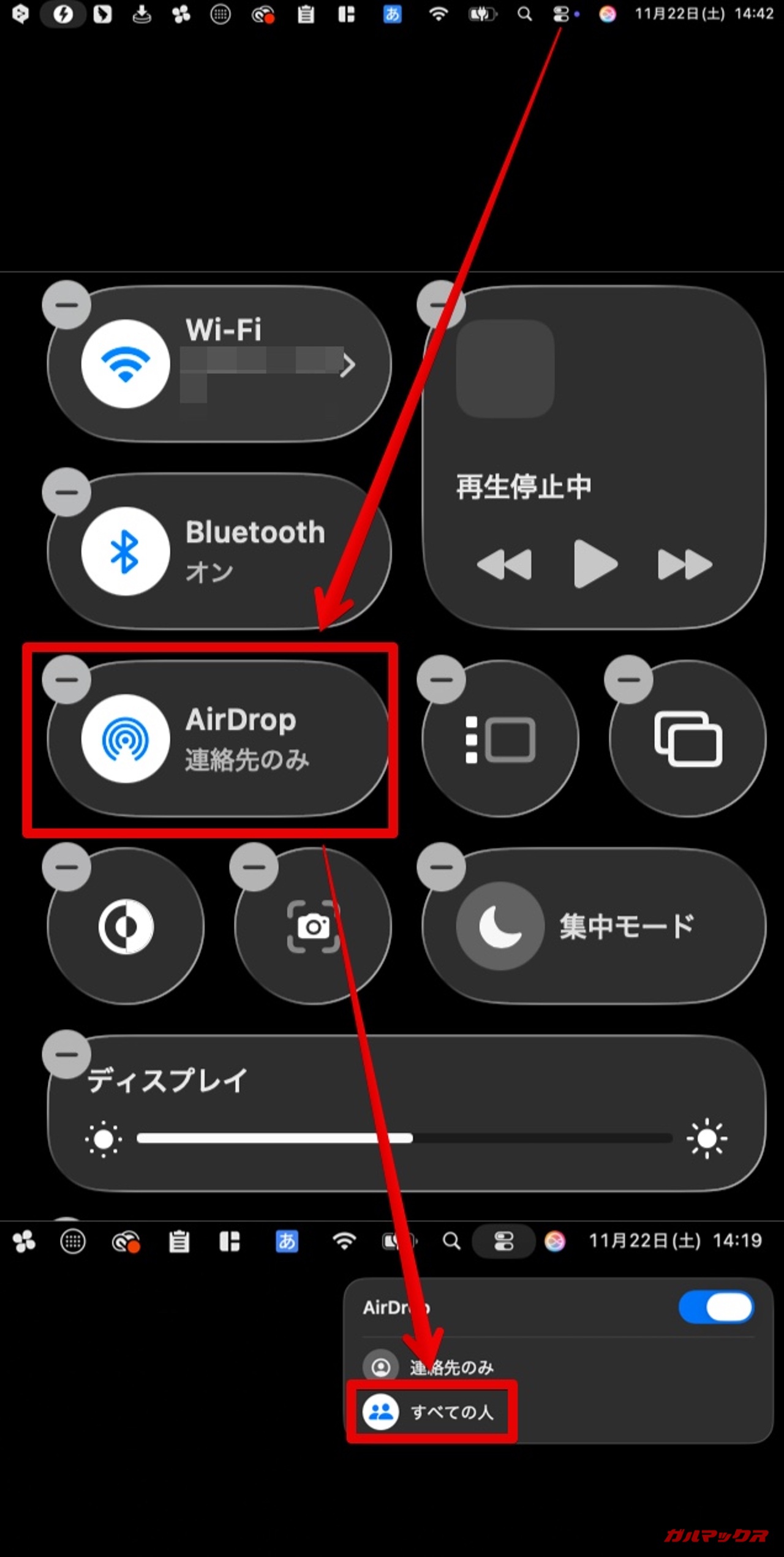 ▼MacBookへ転送したい場合は画面右上のコントロールパネルボタンをクリック。コントロールパネルのAirDropの項目で「すべての人」に変更しましょう。↓