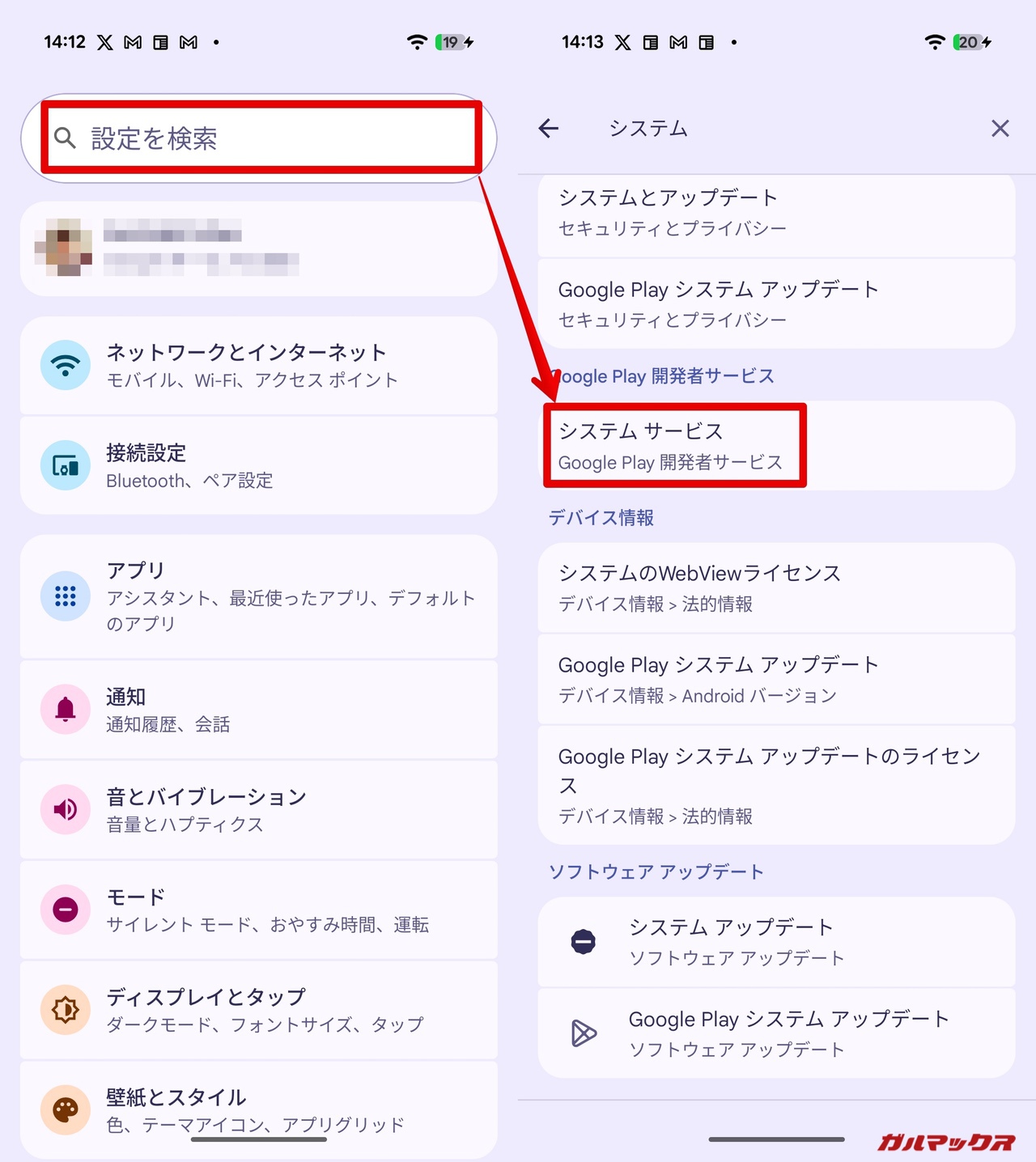 ▼まずはPixel 10の設定画面を開いて「システム」と検索すると表示される「システム サービス」をタップしましょう。↓