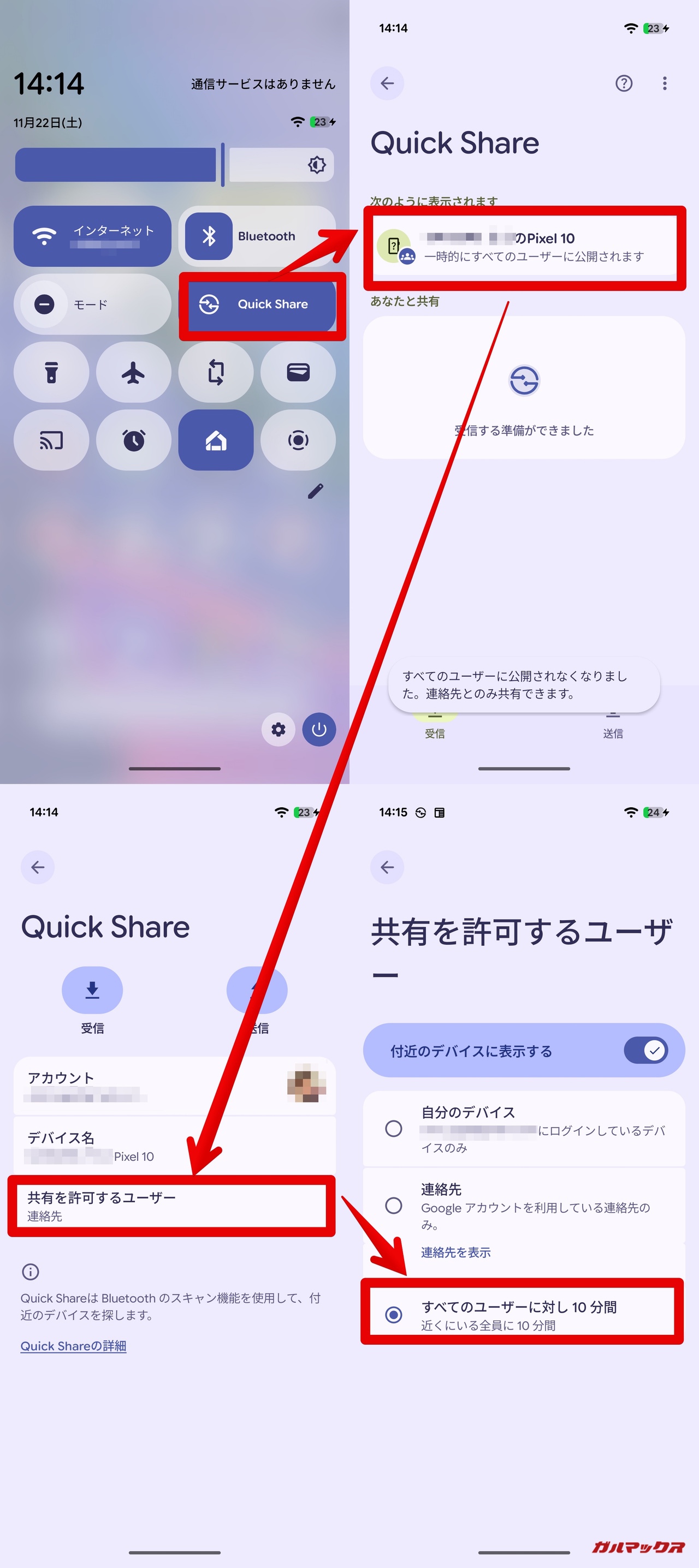 ▼Pixel 10ではクイックパネルのQuick Shareボタンを長押しすると表示される画面から共有を許可するユーザーを「全てのユーザーに対し10分間」に変更します。↓