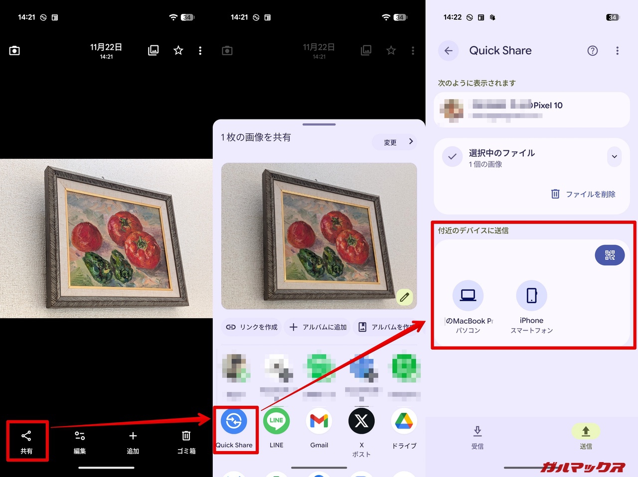 ▼適当にPixel 10で撮影した写真を表示して「共有」をタップ。続いてQuick Shareを選択します。次に表示される画面の「付近のデバイスに送信」という項目にiPhone(Mac)が表示されているはず!↓