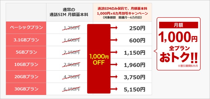 [5月追加]音声通話SIMを申込むと1,000円×半年割引!