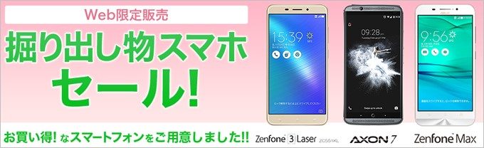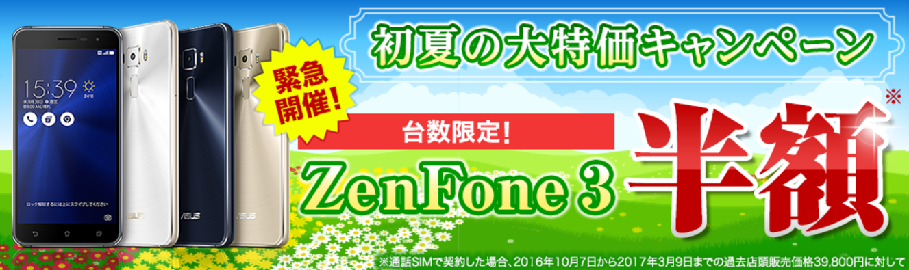 Zenfone 3 | 前回27,800円 ↓ 今回27,700円 | 前回32,700円 ↓ 今回32,600円 最低利用期間 6ヶ月 | 店舗&WEB 前回セールより100円ダウン |