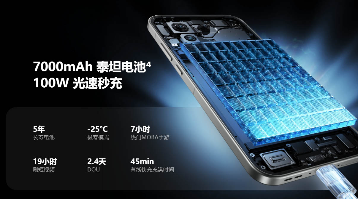 ▼バッテリー容量は7000mAh。有線充電は100W(SUPERVOOC)、44W(UFCS)に対応しており、45分で満充電ができるとのことです。↓