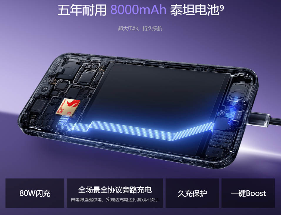 ▼バッテリー容量は8000mAh。80W(SUPERVOOC)、55W(PPS)、44W(UFCS)の急速充電に対応。バイパス充電なども利用できます。↓