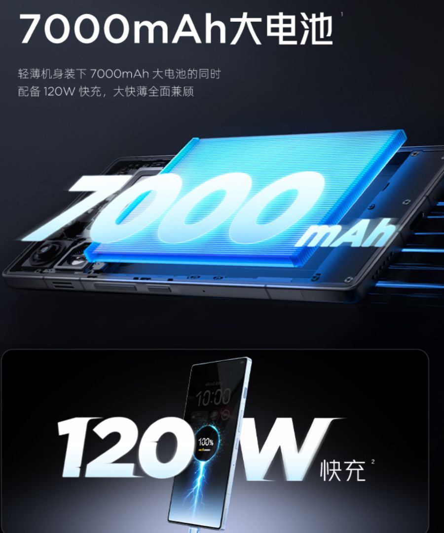 ▼バッテリー容量は7000mAh。120Wの急速充電に対応しています。バッテリーではなく本体に直接電力を供給するバイパス充電機能も搭載しています。↓
