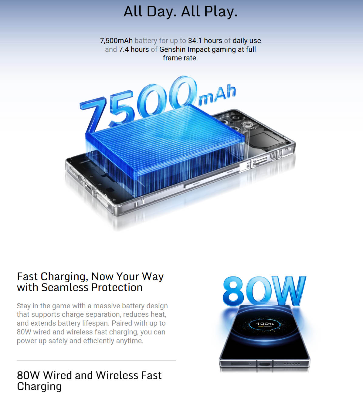 ▼バッテリー容量は7500mAh。原神を7.4時間連続でプレイすることができるそう。80Wの有線充電及びワイヤレス充電に対応しています。↓