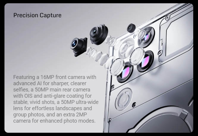 ▼リアカメラは50MP(広角、f/1.88)+8MP(超広角、f/2.0)+2MP(マクロ)のトリプルカメラ構成。↓