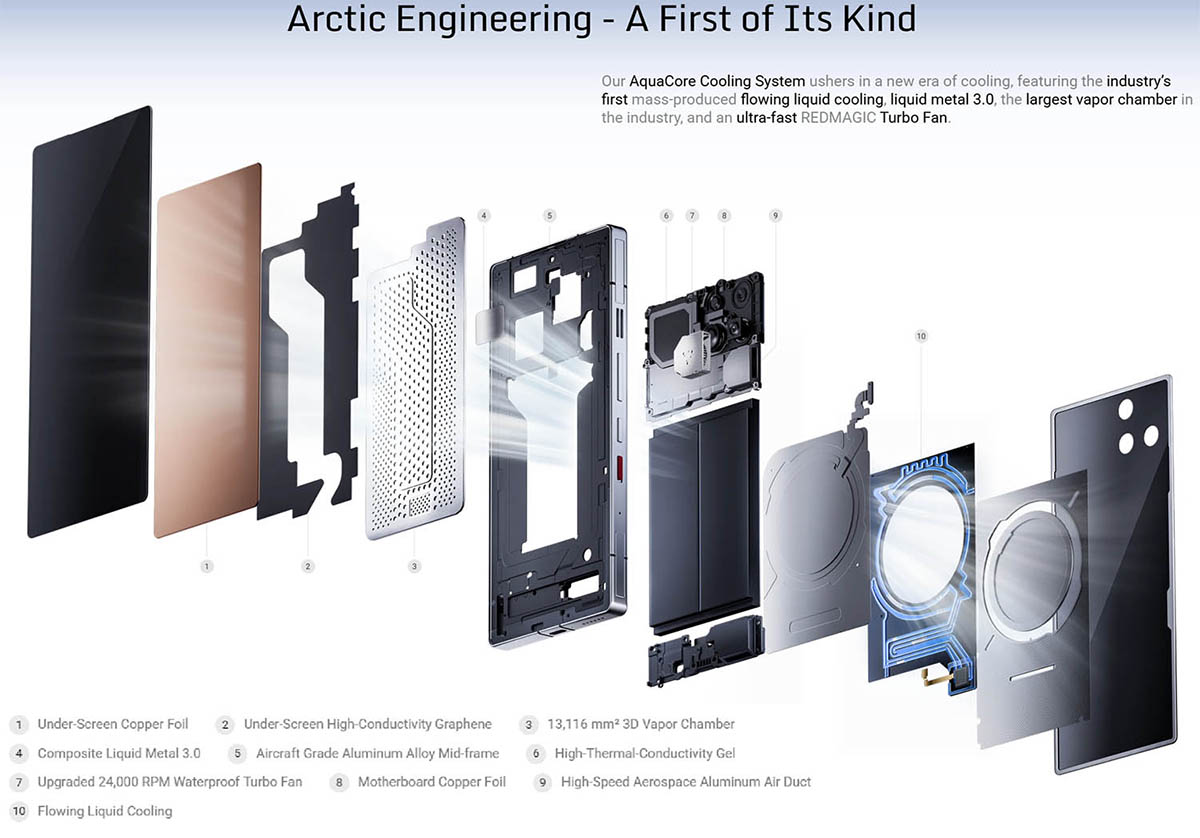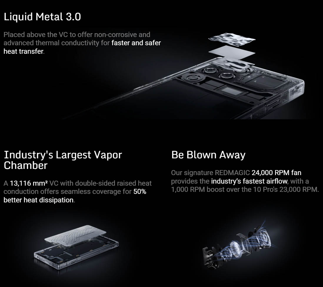 ▼ゲーミングスマホを名乗るだけあってパフォーマンスを向上させるための冷却性能もトップクラス。あの手この手をつかって冷却をしているようです。↓