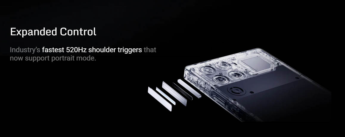 ▼本体側面にはショルダートリガーが搭載されており、ゲーム時に割り当てることができます。本体上部には3.5mmイヤホンジャックを搭載しています。↓