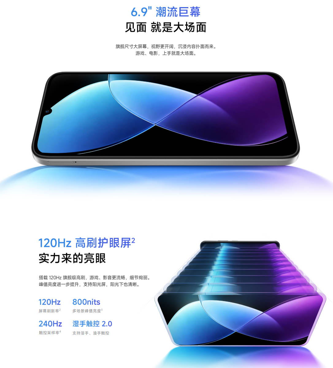 ▼ディスプレイは6.9インチの液晶。解像度は720×1600のHD止まり、120Hzリフレッシュレートに対応しています。最大輝度は800nits。↓