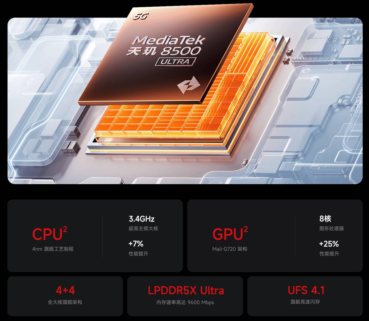 ▼SoCはDimensity 8500‐Ultraを搭載!メモリは12GB/16GB(LPDDR5X MAX)、ストレージは256GB/512GB(UFS 4.1)。↓