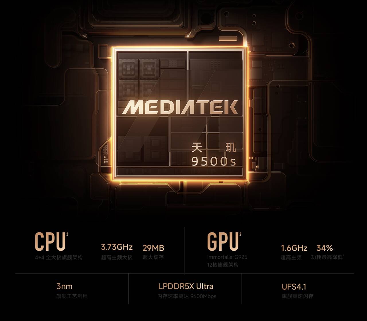 ▼SoCはDimensity 9500sを搭載!メモリは12GB/16GB(LPDDR5X Ultra)、ストレージは256GB/512GB(UFS 4.1)となっています。↓