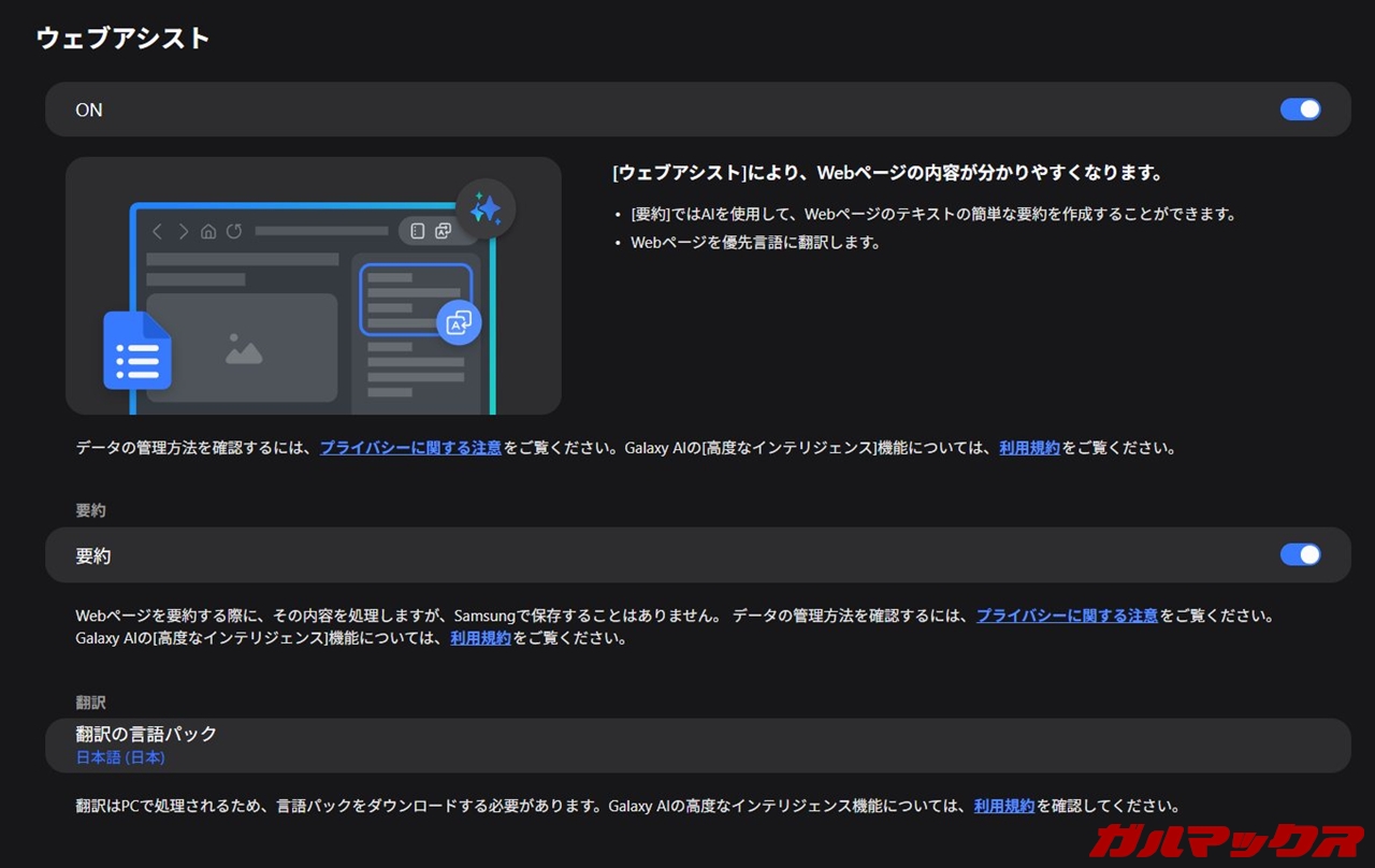 ▼Samsungブラウザは流行りのAIにもバッチリ対応。今のところは「WEBページの要約」および「翻訳」の2つに対応。↓
