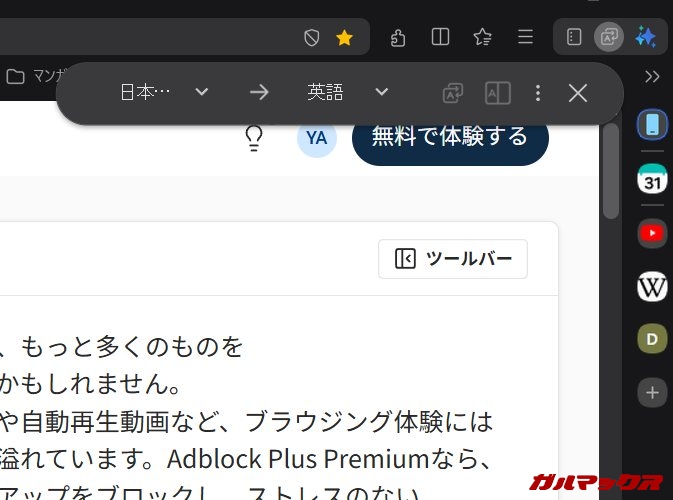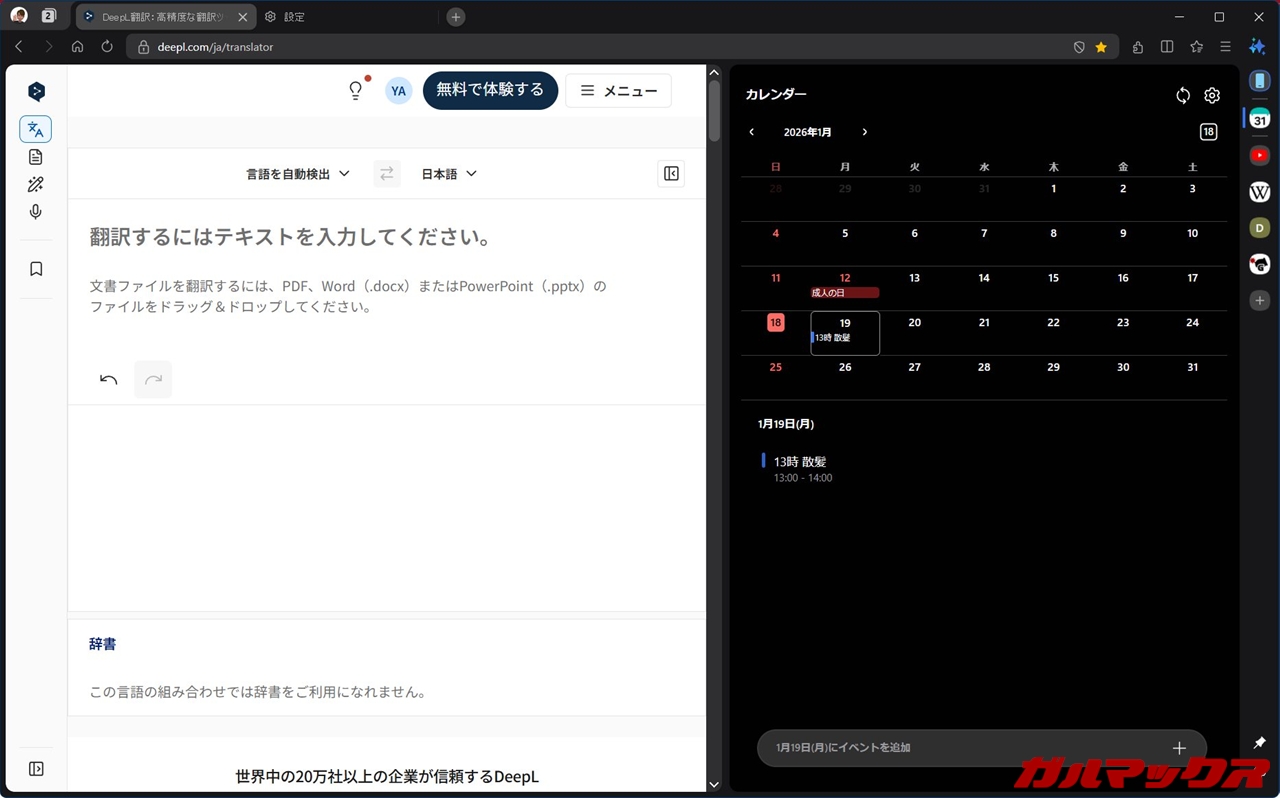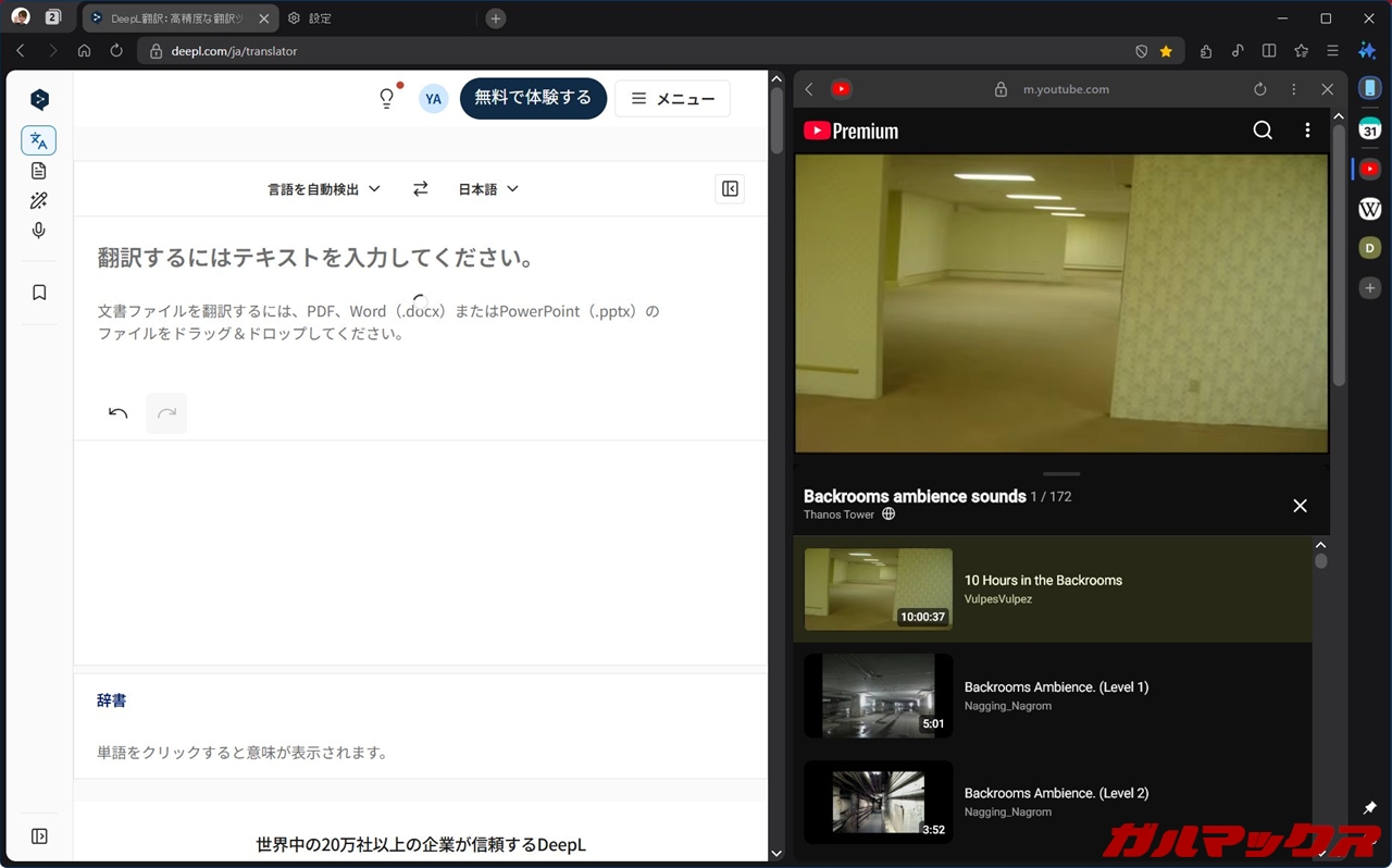 ▼右側面にあるアイコンを押せば、タブをこんな感じで分割してくれます。画像では左側に翻訳アプリのDeepL、右側にYouTubeで配置しています。ながら作業が非常に捗る。↓