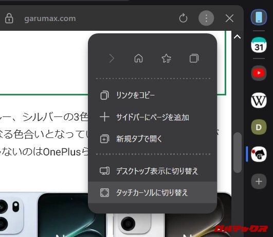 ▼またサイドバー画面ではスマホ風の表示に切り替えたり、タッチ操作モードが使えたりします。マウス状態でも画面をスワイプしてスクロールするという操作方式に切り替え可能。↓