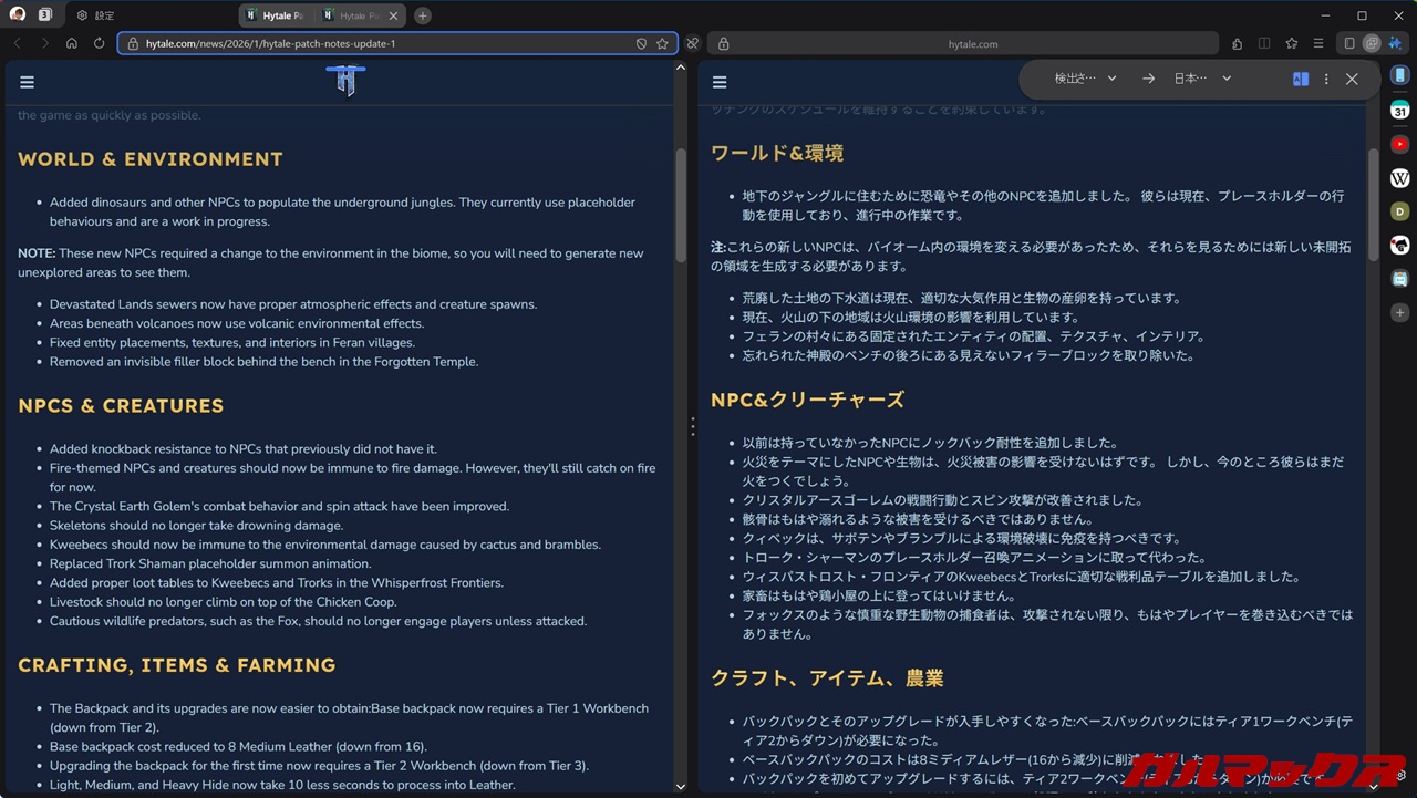 ▼また原文と翻訳の見比べ表示に対応しているのもSamsungブラウザの魅力!ちなみにこのページは最近ちょぼちょぼ話題になっているサンドボックスゲーことHytaleのパッチノートのページ。↓