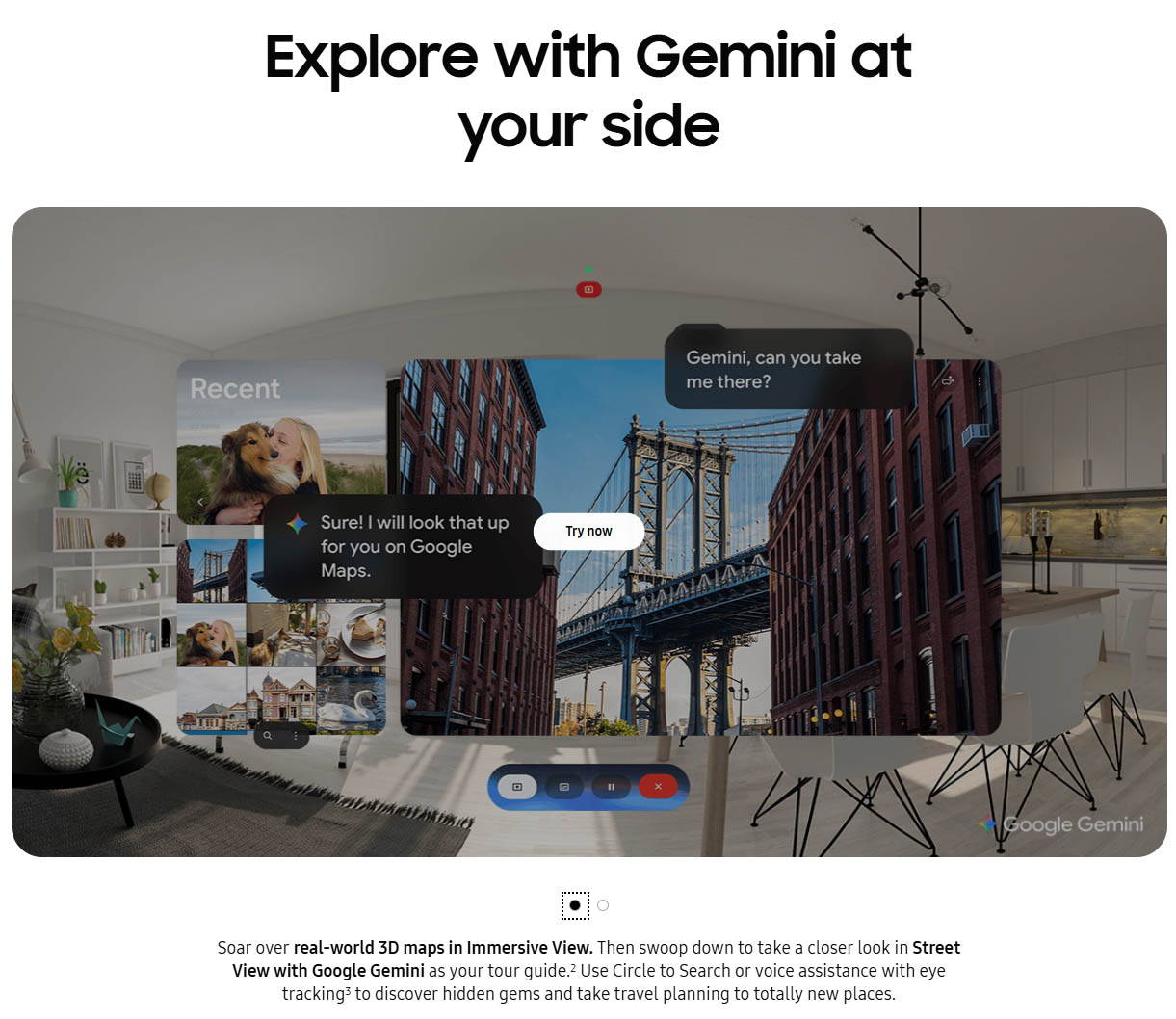 ▼Google Geminiを搭載。かこって検索やアイトラッキング付きの音声アシスタントが利用できます。他にもストリートビューをGeminiのツアーガイド付きで楽しんだりもできるそう。↓