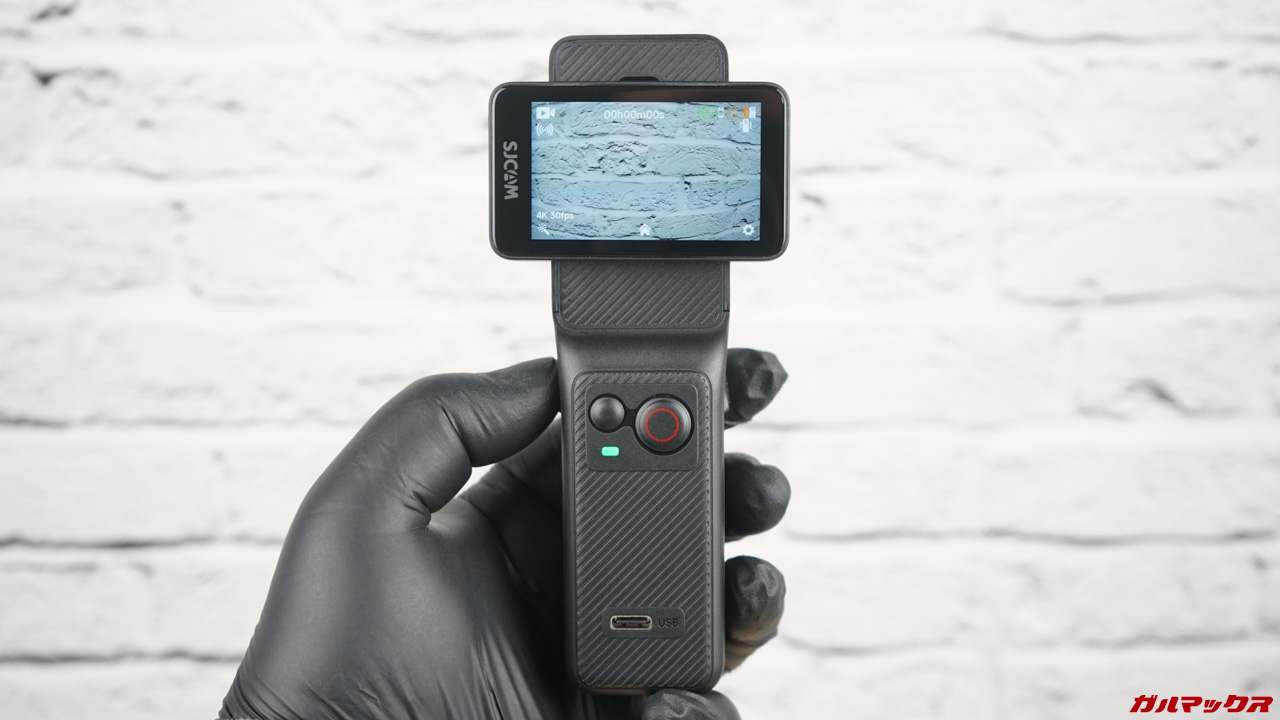 ▼カメラをドッキングしている状態ではグリップ部のディスプレイを時計回りに回転することで電源がオン、画面を戻すとオフになる挙動。↓