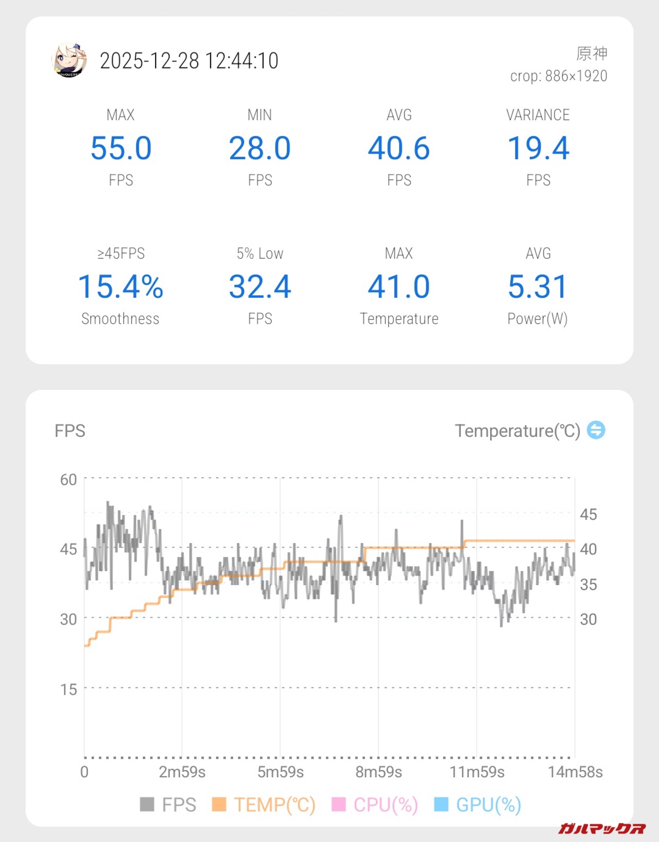 ▼結果は最高55FPS、下限28FPS、平均40FPSとなりました。↓