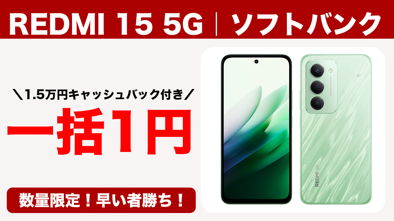 REDMI 15 5Gがソフトバンクで一括1円アンド1.5万円CB