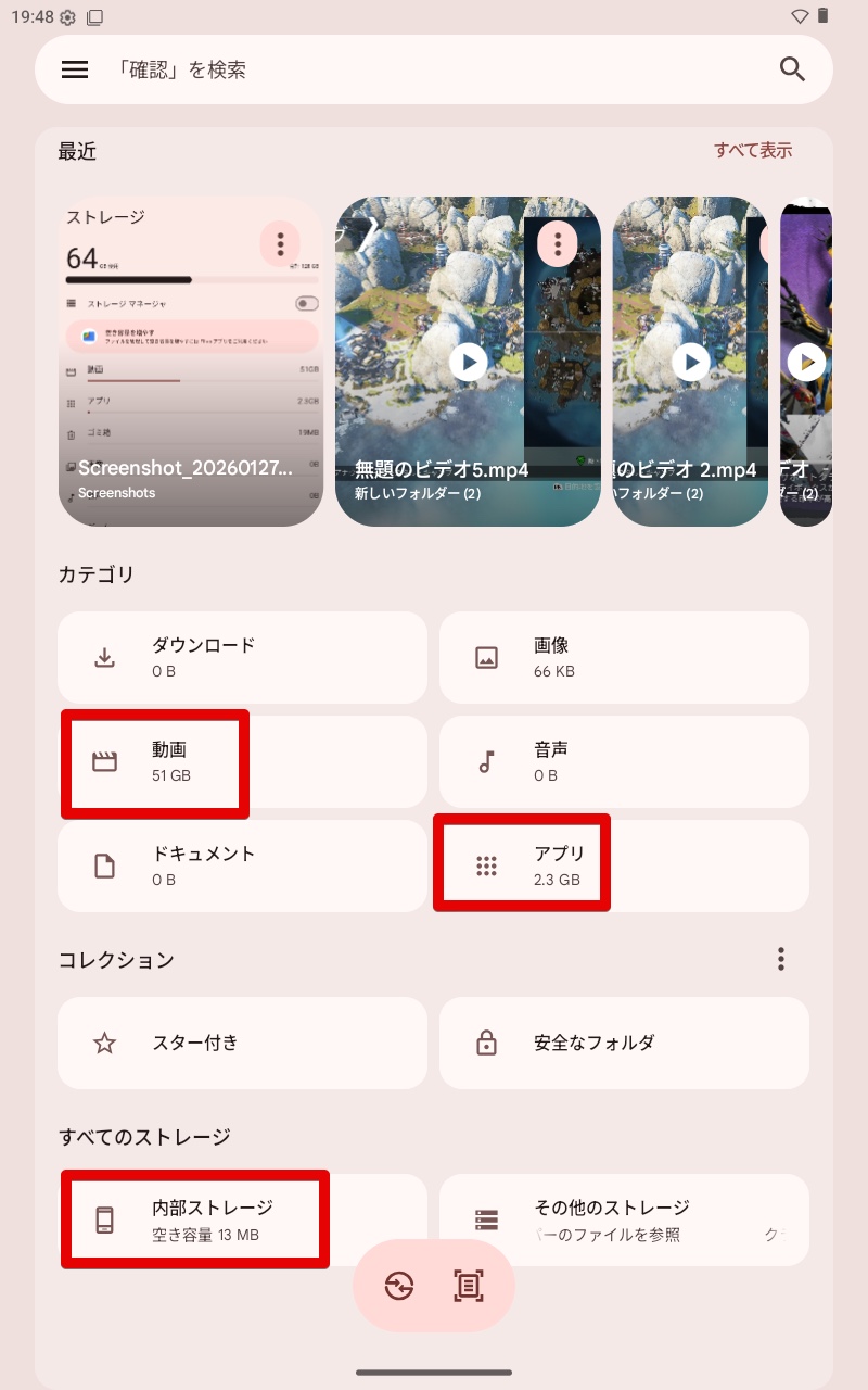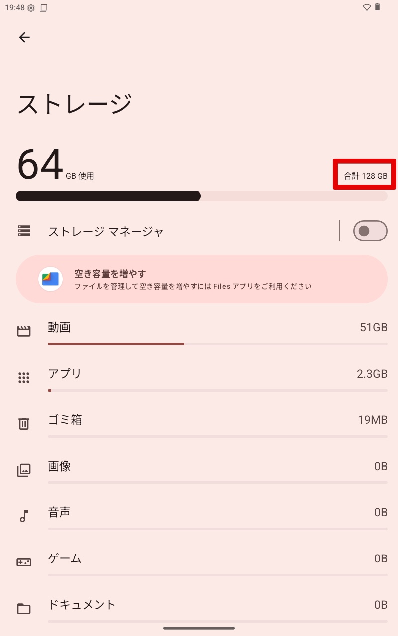 ▼次はAndroid製品にプリインされているGoogle Fileで確認。128GBあるはずなのに64GBほどデータを入れた状態で残り13MBと表示された。128GBの総容量と残容量が合わない。問題あり。↓