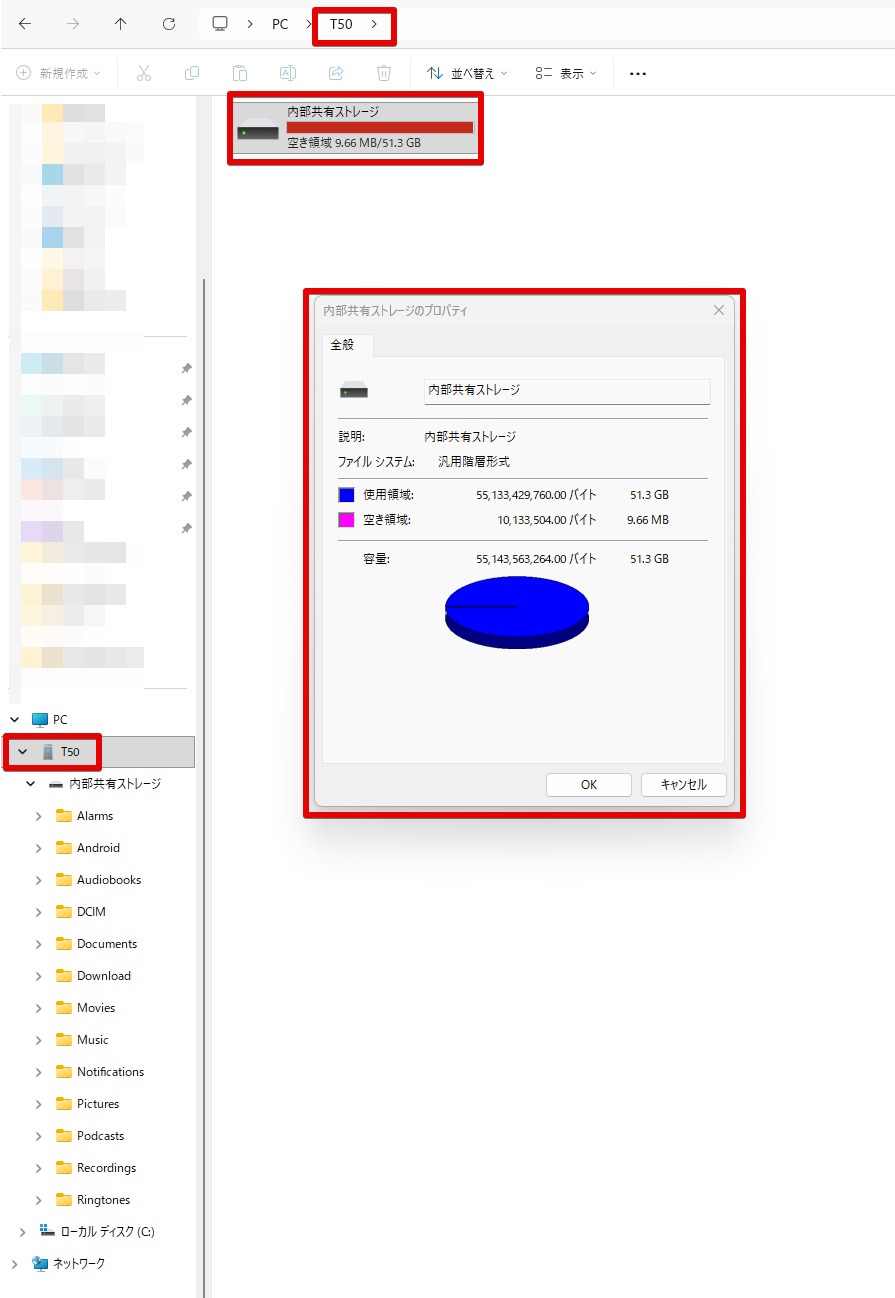 ▼Windows PCに接続してストレージ容量を確認。使用領域と空き領域を足しても128GBには届かない。問題あり。↓