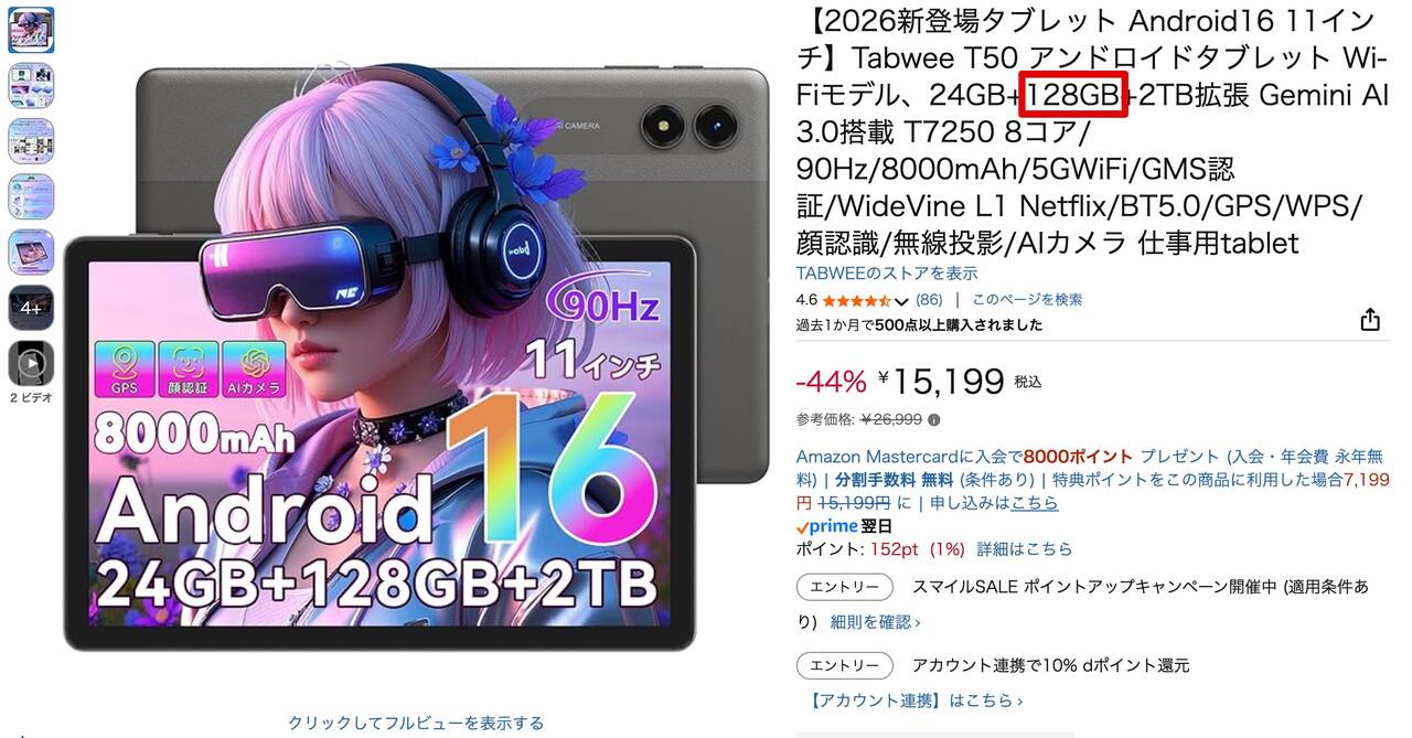 ▼まずはAmazonの表示。ストレージは128GBと記載されている。問題なし。↓