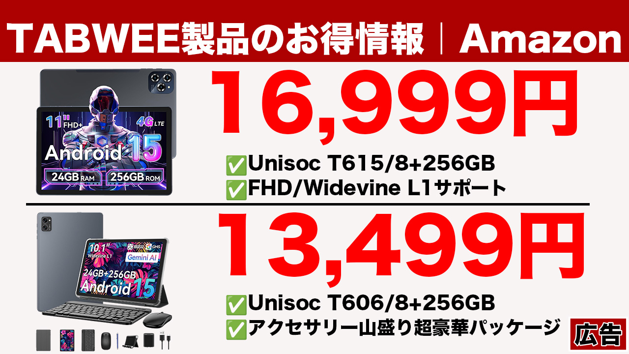 今回の記事はTABWEEのタブレットをラインナップしています。項目ごとに特徴、セール価格、購入先をまとめています。購入の参考にどうぞ(`・ω・´)。