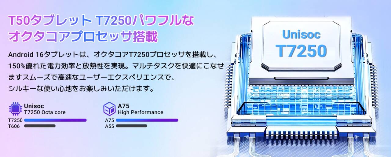 ▼Tabwee T50が搭載するSoCはUnisoc T7250。メモリは6GBでストレージは128GB。microSDにも対応していて最大2TBの拡張もできるとのこと。↓