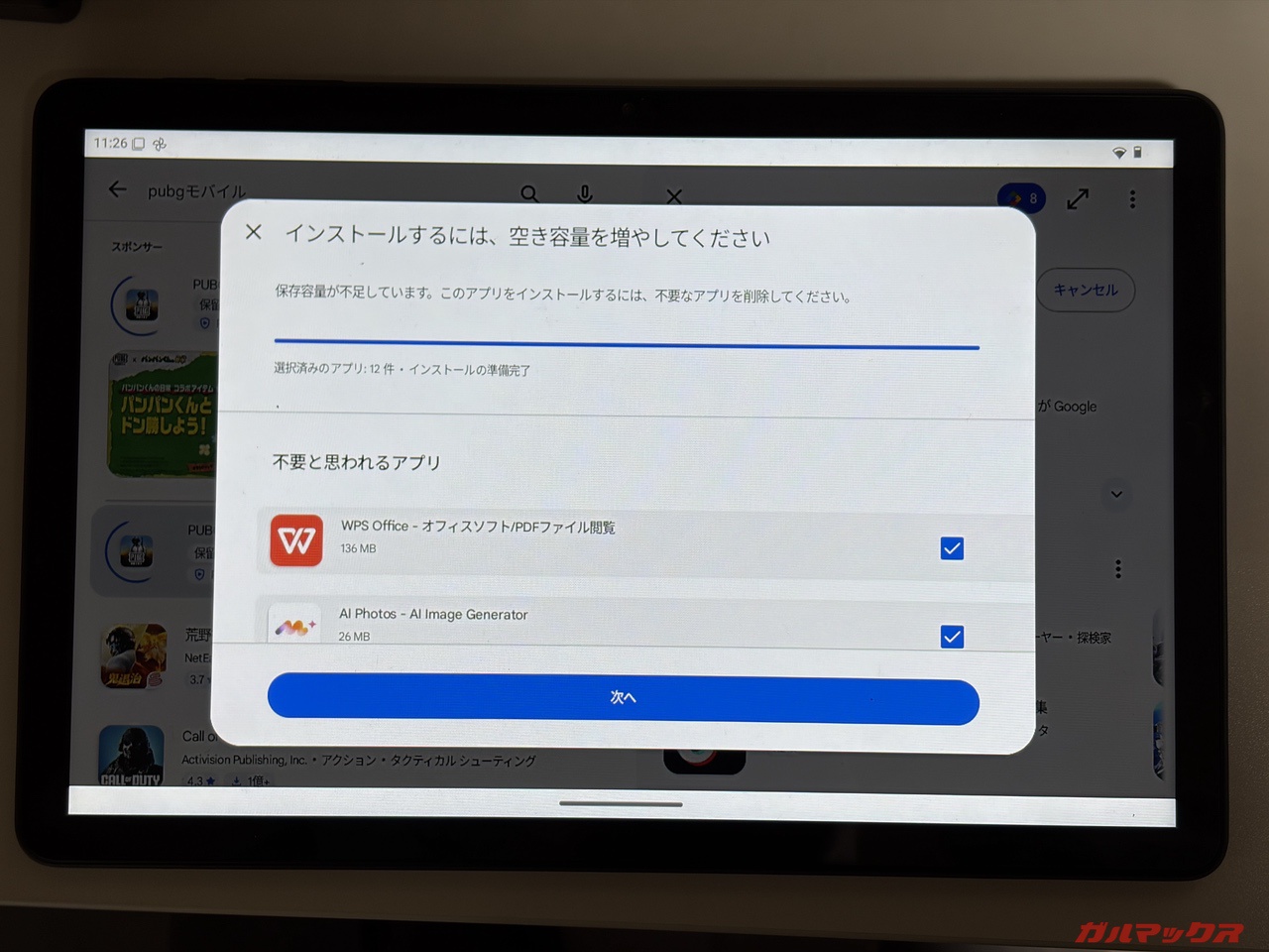 ▼ダウンロードが停止しても、それまでに受信したデータは保持されます。この状態でPUBGモバイルをダウンロードしてみましたが、同様に容量不足でインストール不可となりました。↓