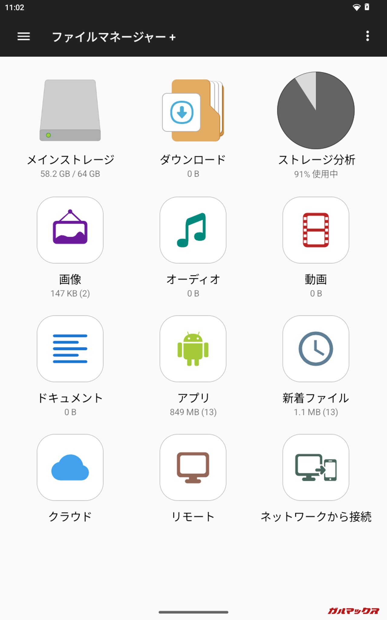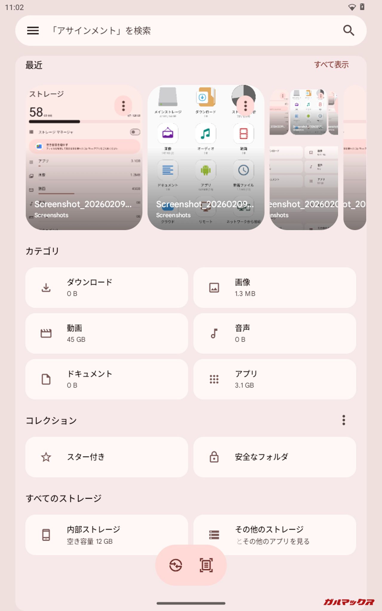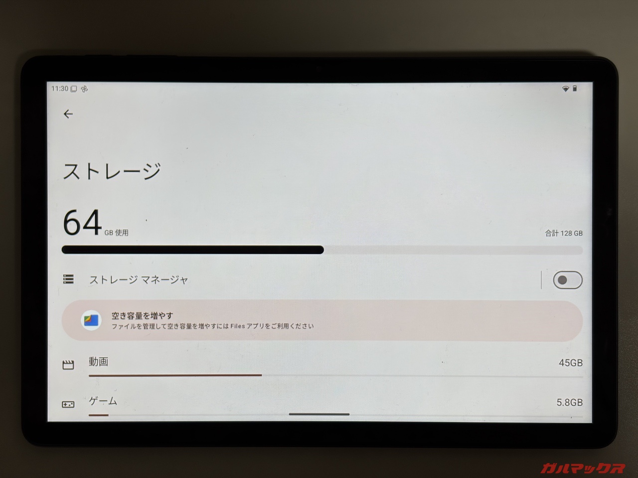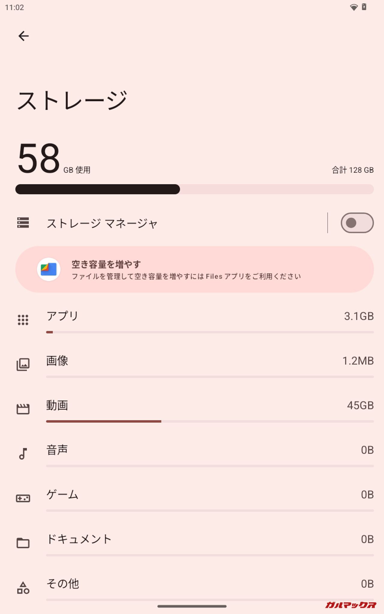 ▼41.6GB(10.4GB×4)投入後の結果。本体ストレージは「58GB/128GB」、Filesでの残容量は「12GB」、ファイルマネージャ+は「58.2GB/64GB」、PC上では「114GB/128GB」となりました。↓