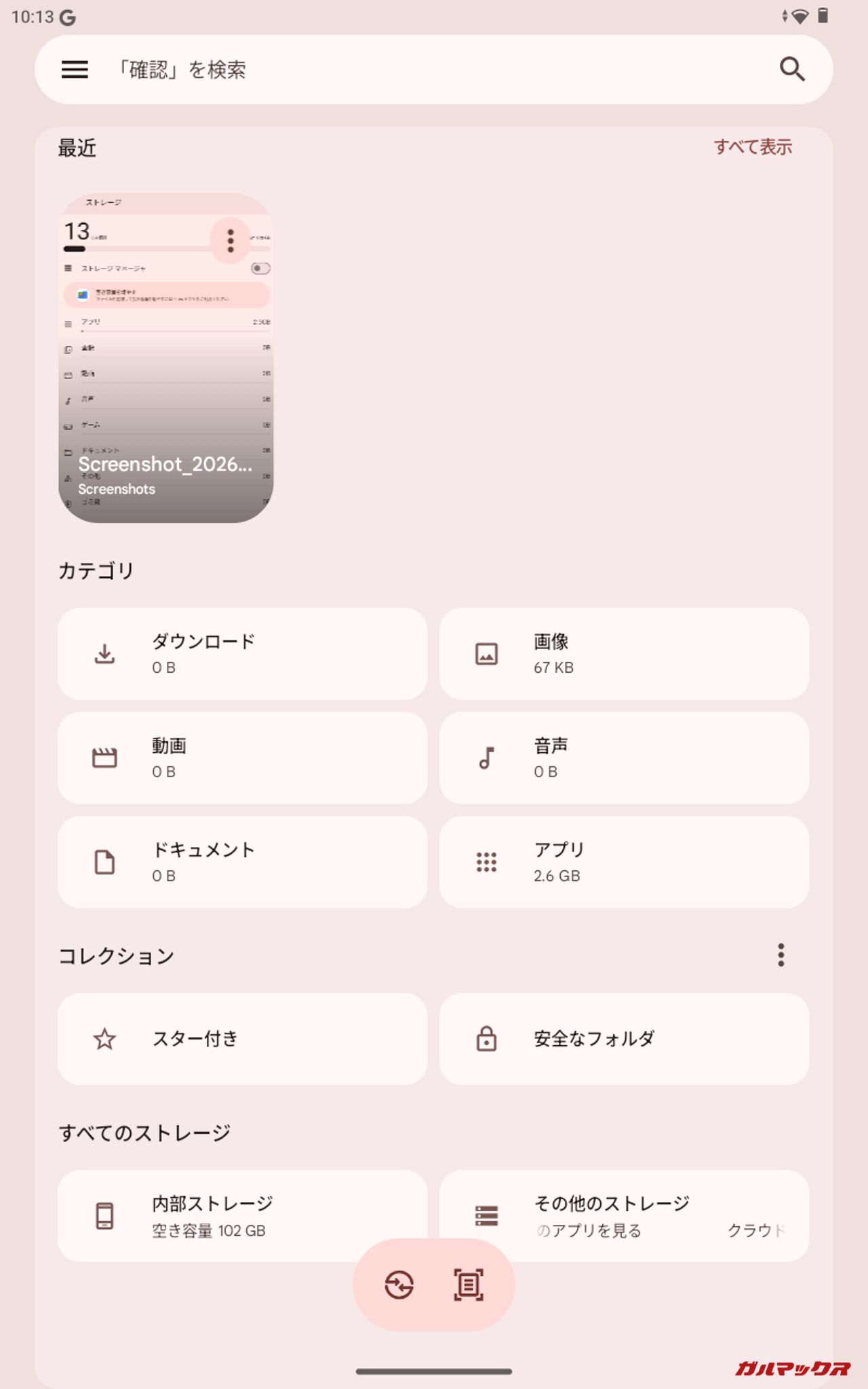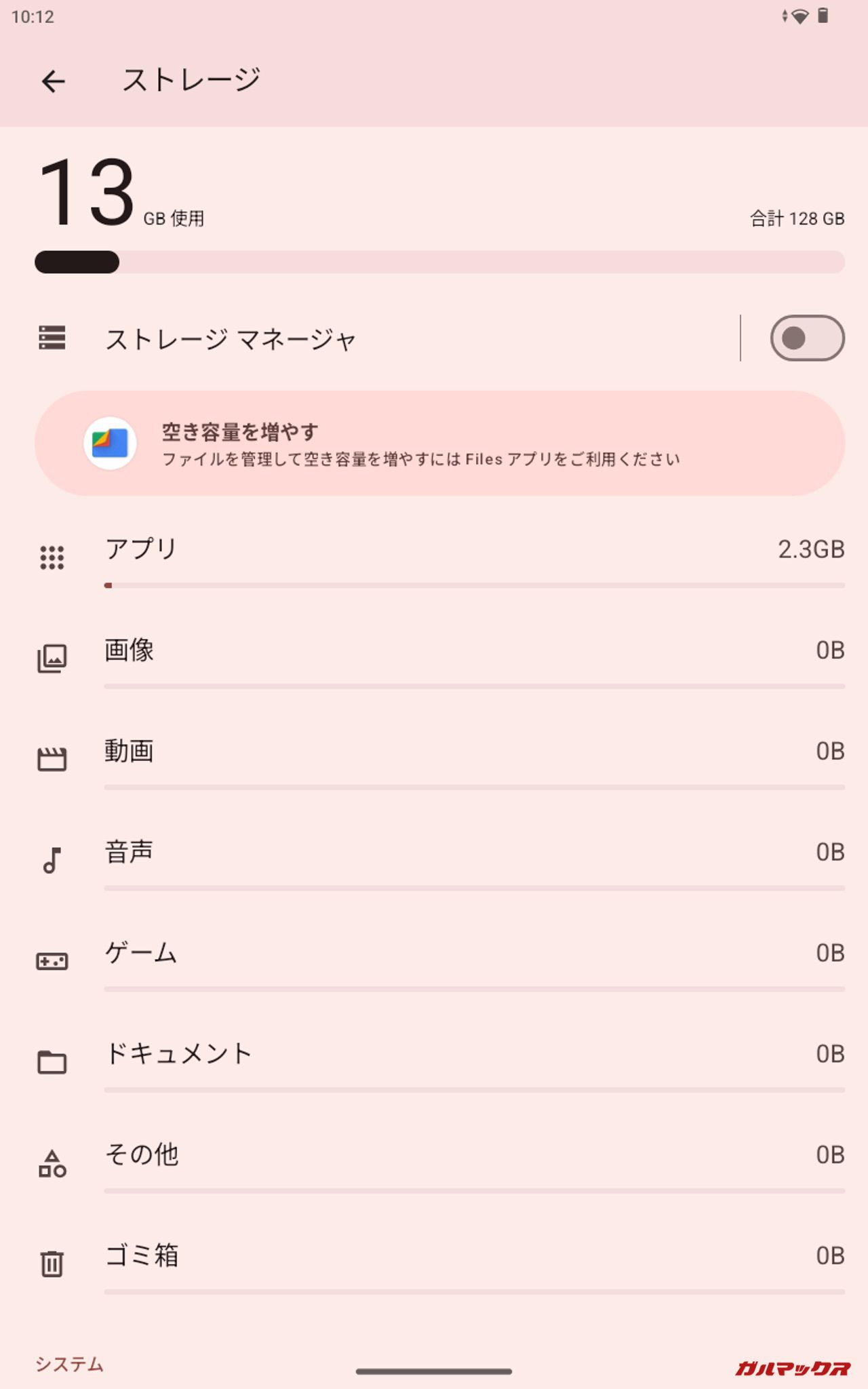 ▼初期状態。本体ストレージは「13GB/128 GB」、Filesでの残容量は「102GB」、PC上では「10.2GB/128GB」となりました。↓