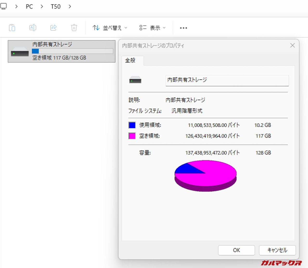 タブレットの設定から確認できるストレージ容量および接続したPC上の双方で128GBと認識。前回PC側で128GBと正しく認識されなかった挙動については、本アプデで修正を確認しました。またFilesアプリの残容量も100GB以上で認識されるようになっています。