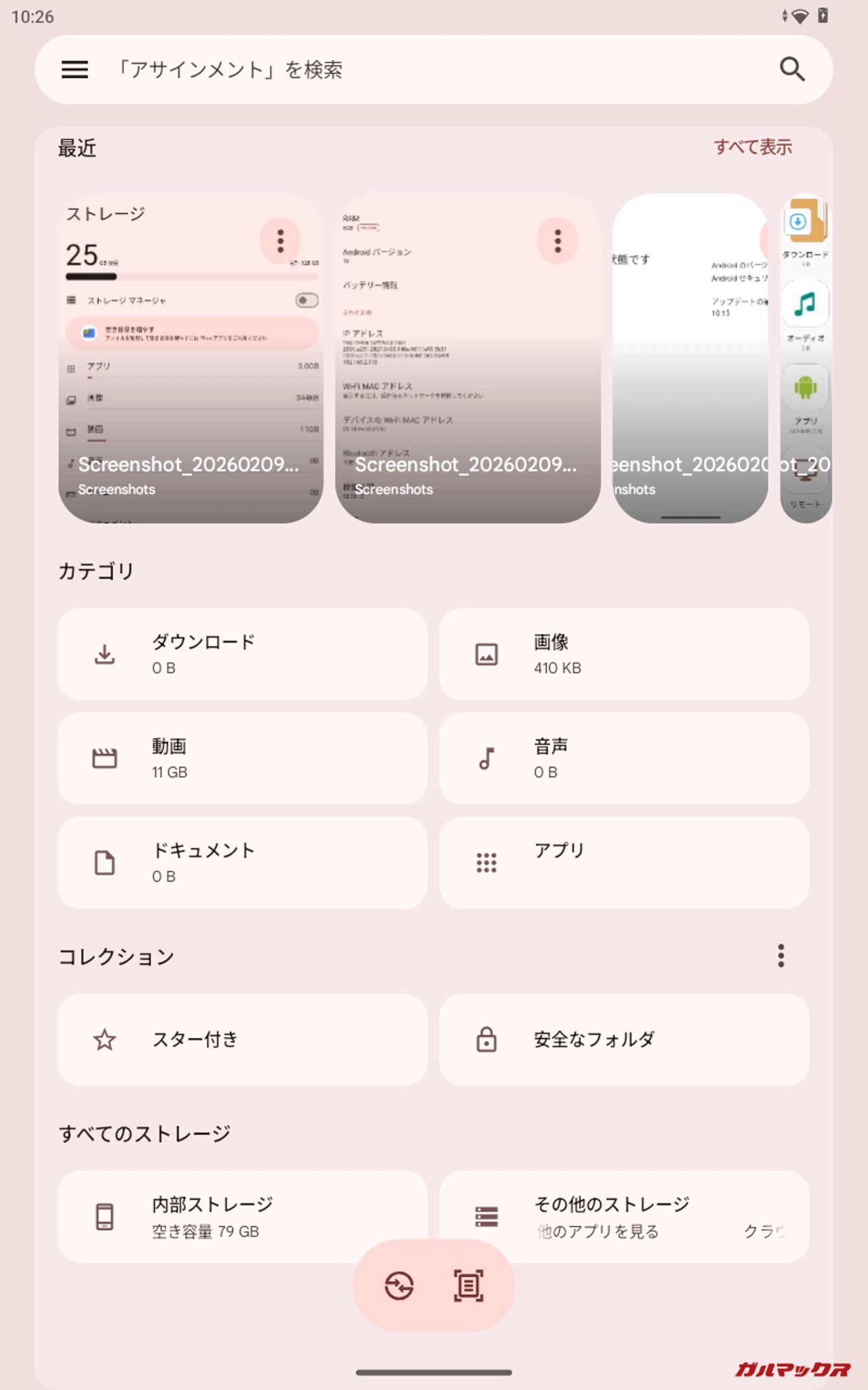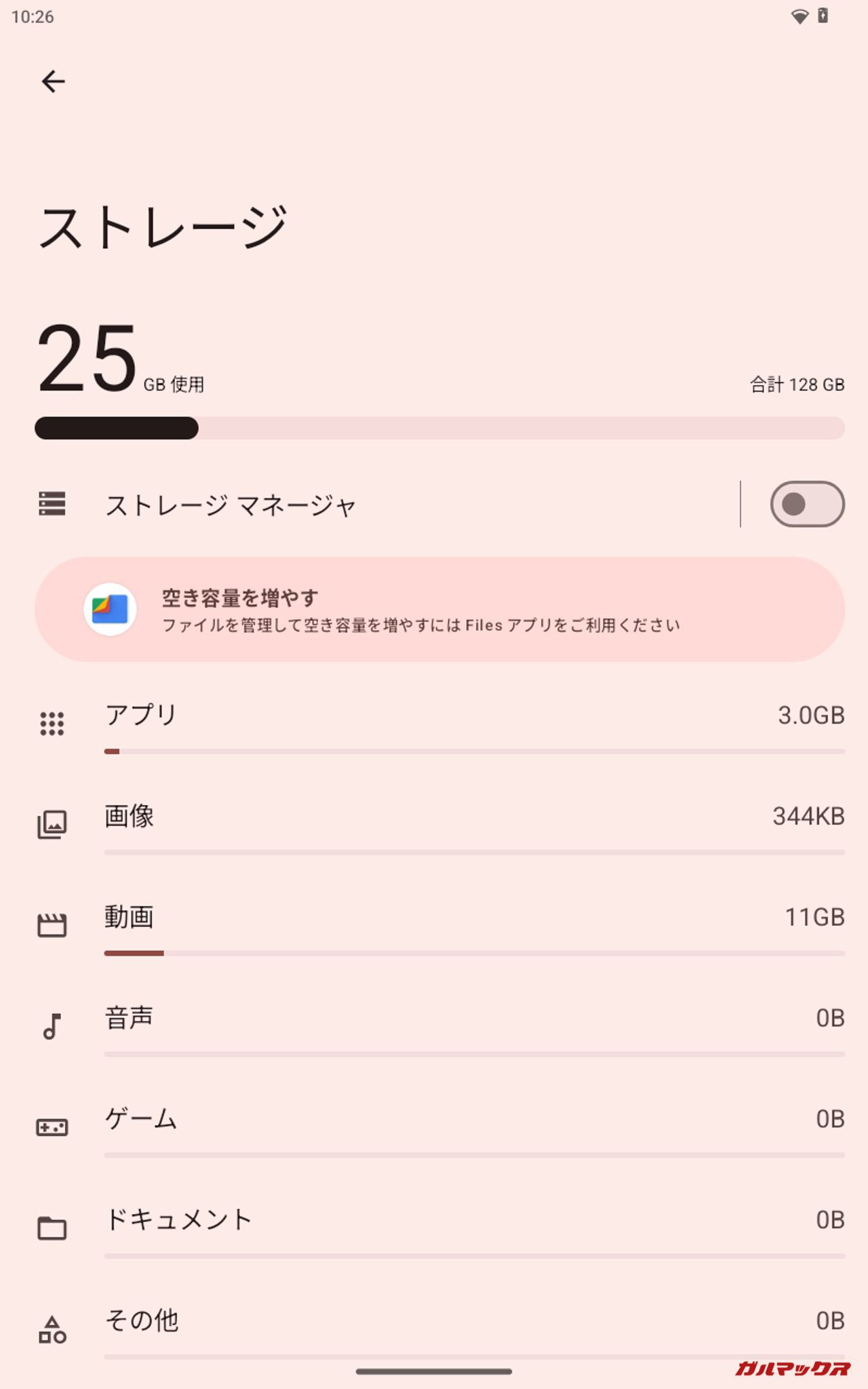 ▼10.4GBのデータを投入した際の結果。本体ストレージは「25GB/128GB」、Filesでの残容量は「79GB」、ファイルマネージャ+は「24.5GB/64GB」、PC上では「36.3GB/128GB」となりました。↓