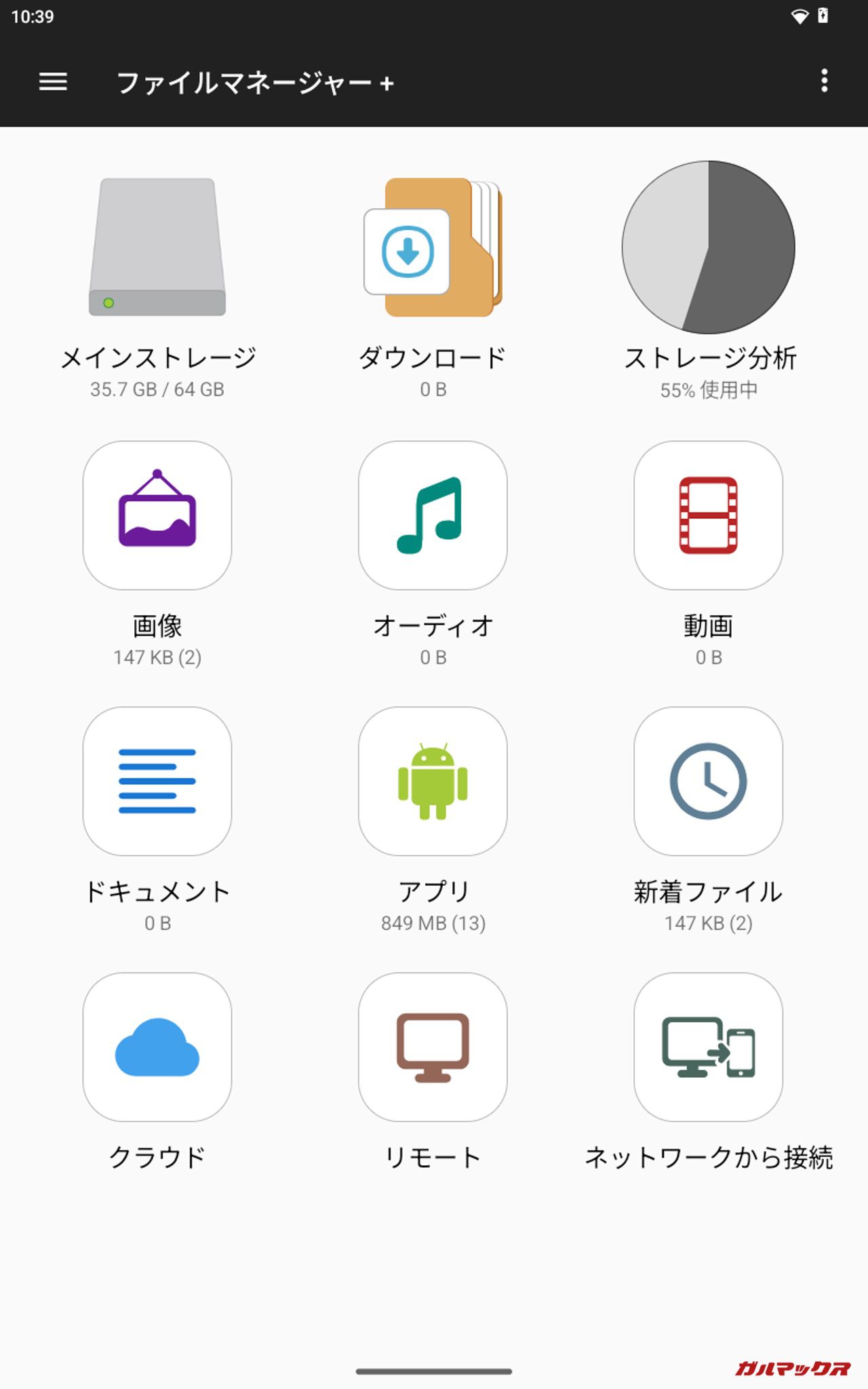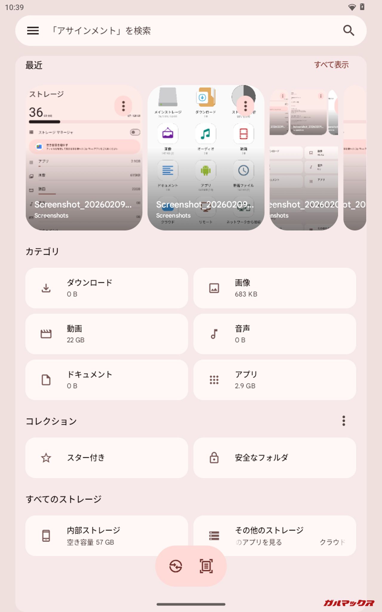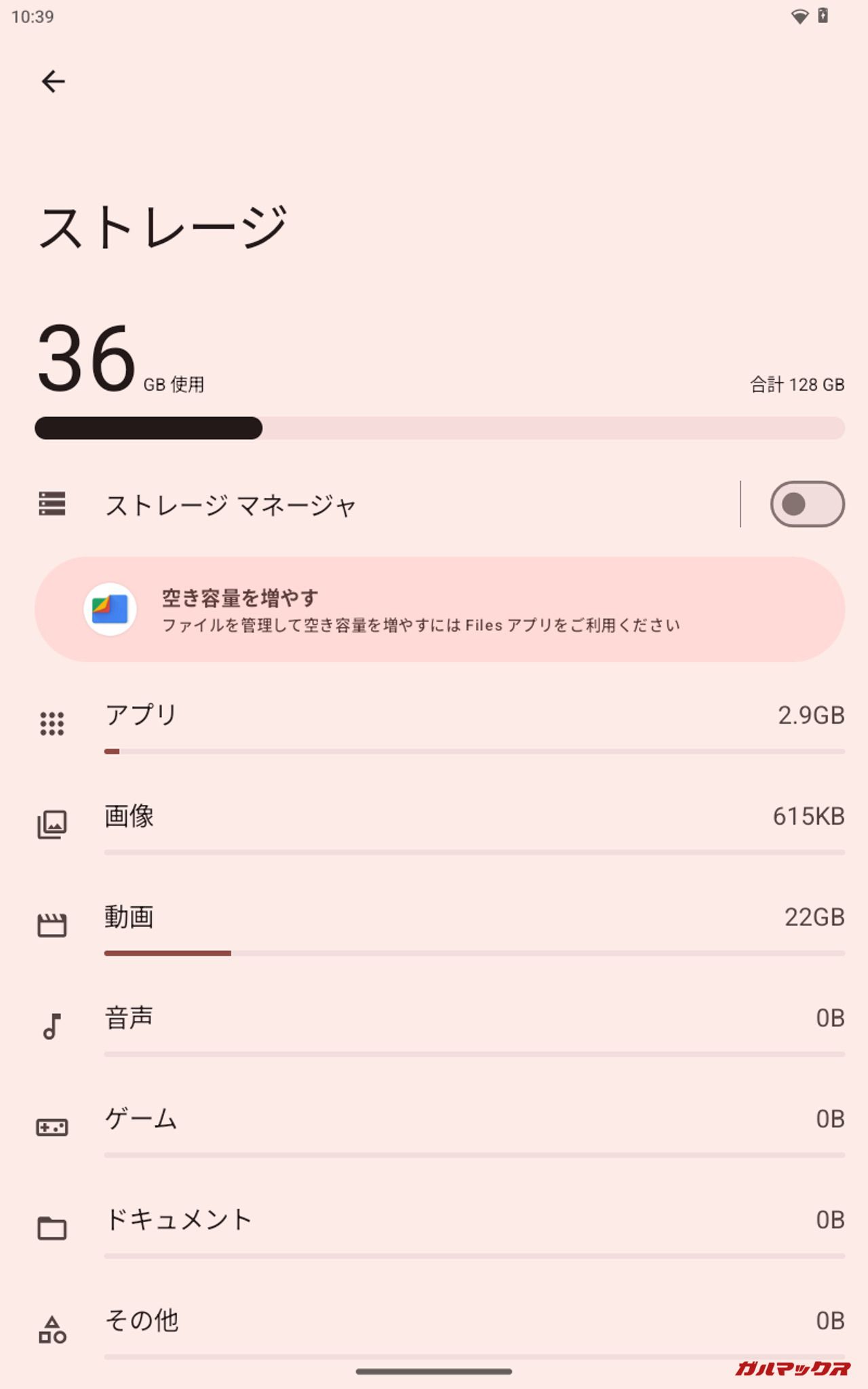 ▼20.8GB(10.4GB×2)投入後の結果。本体ストレージは「36GB/128GB」、Filesでの残容量は「57GB」、ファイルマネージャ+は「35.7GB/64GB」、PC上では「62.1GB/128GB」となりました。↓