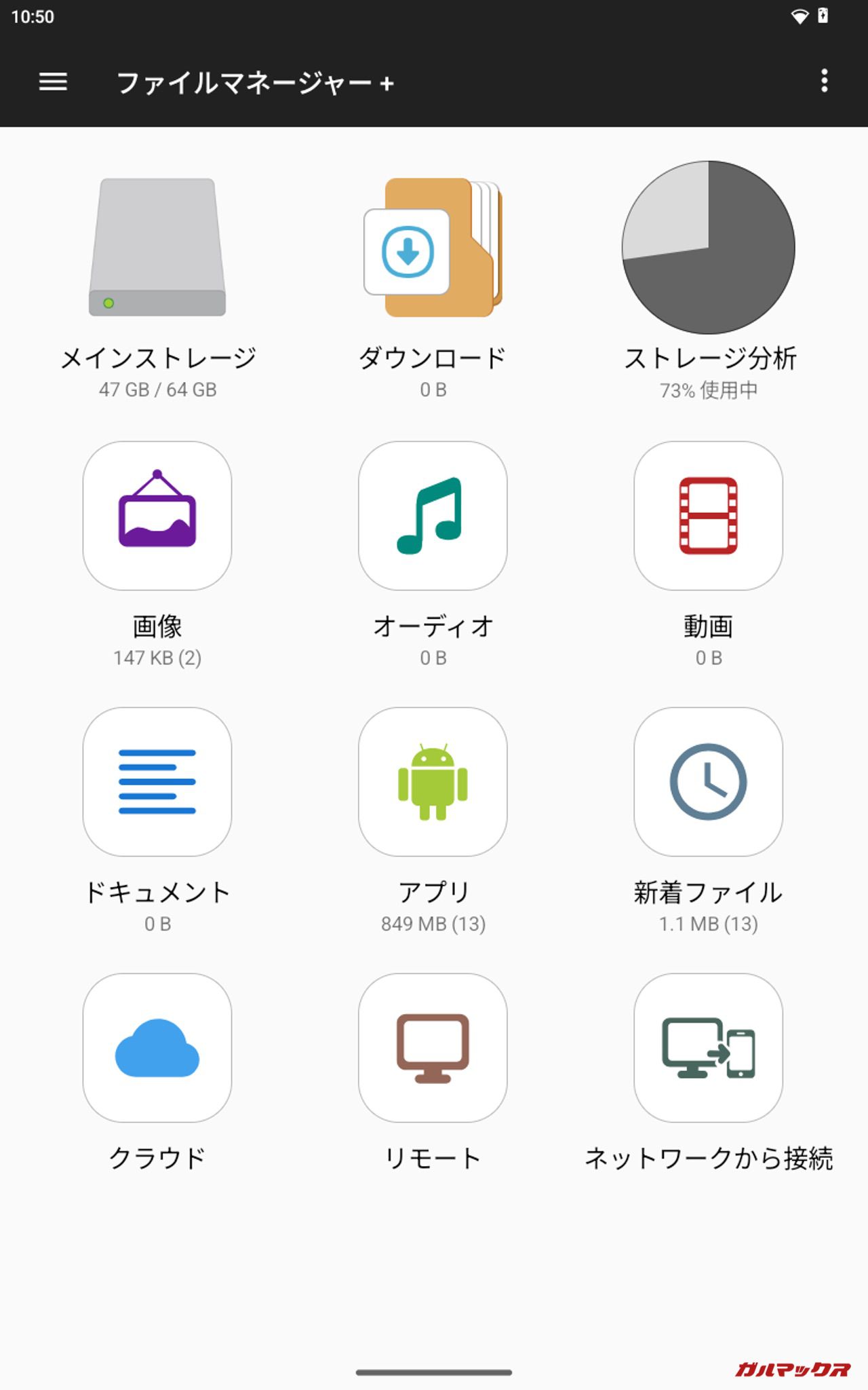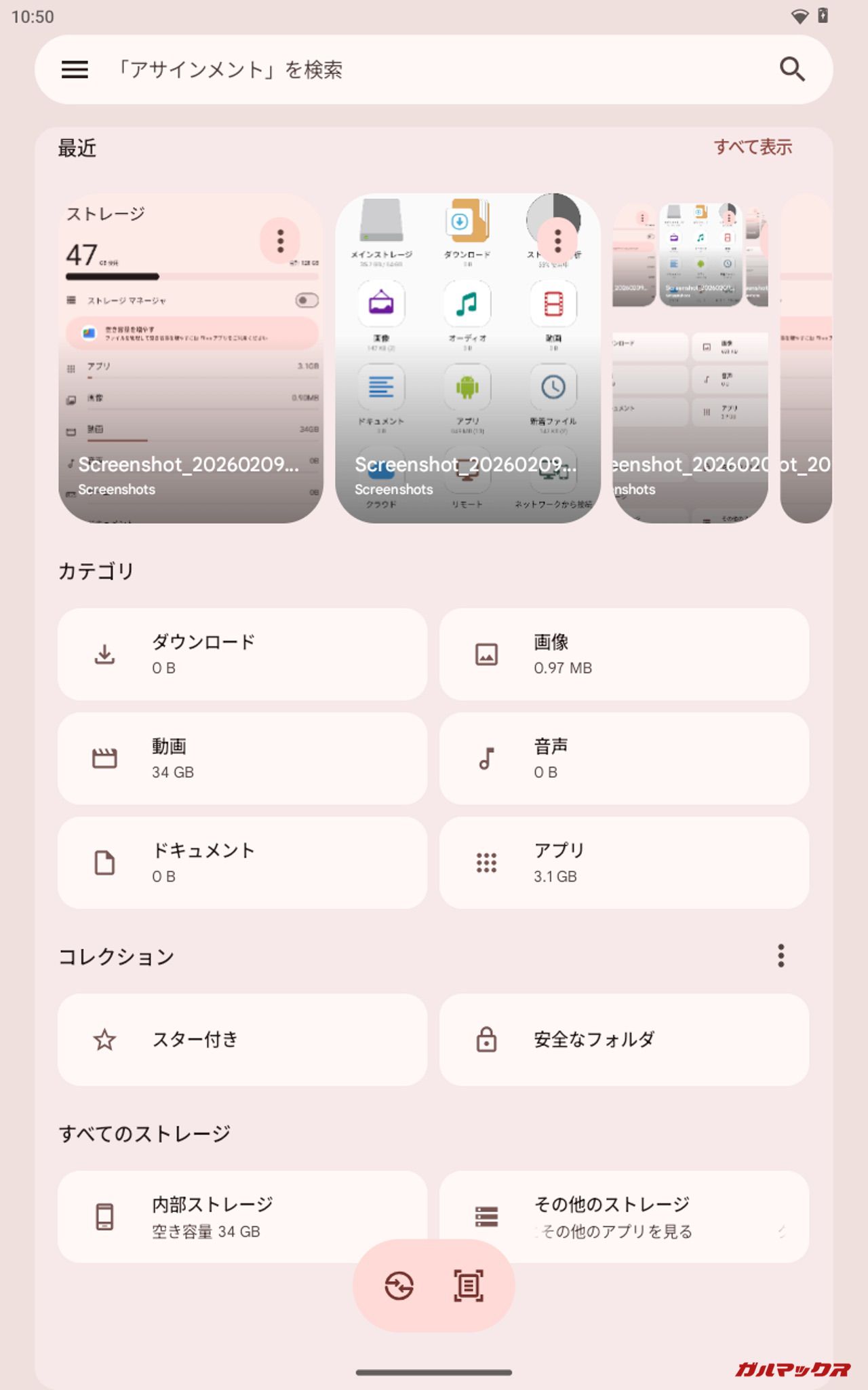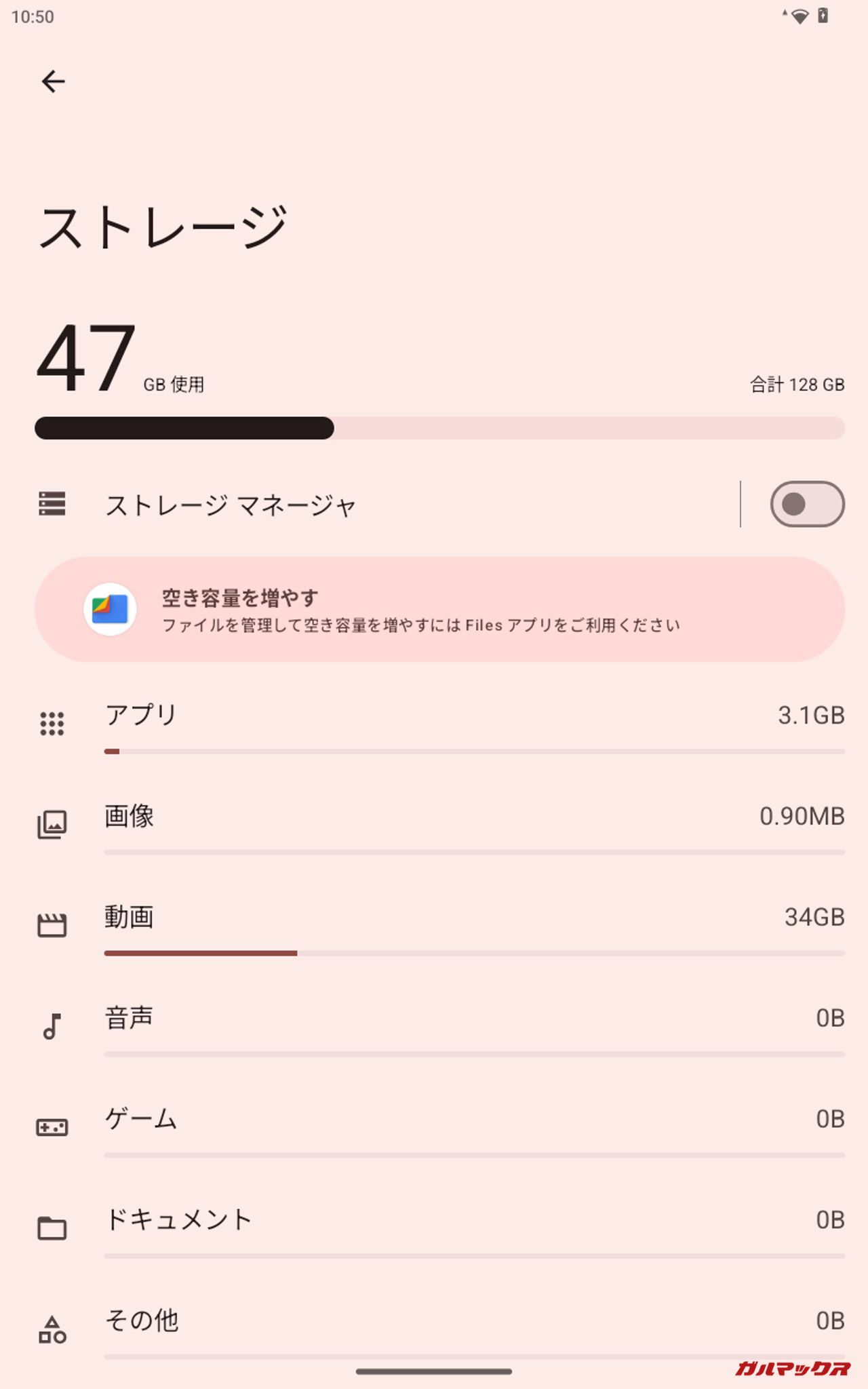 ▼31.2GB(10.4GB×3)投入後の結果。本体ストレージは「47GB/128GB」、Filesでの残容量は「34GB」、ファイルマネージャ+は「47GB/64GB」、PC上では「88.5GB/128GB」となりました。↓
