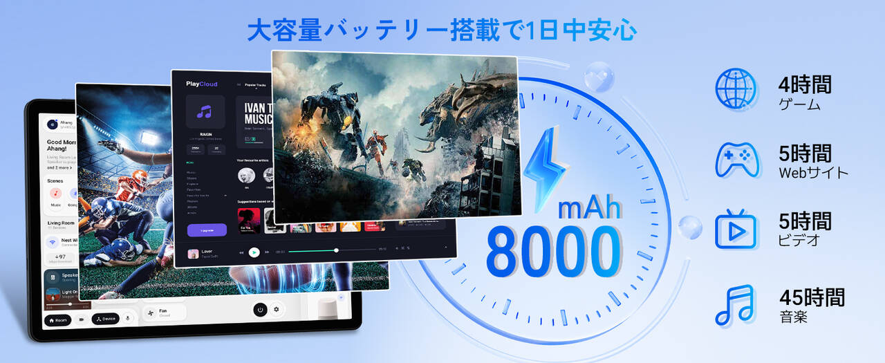 ▼バッテリー容量は8000mAhとタブレットの標準的サイズ。電池持ち公称値は動画視聴で5時間だそうです。動画見まくったりしたら半日も持たないタイプ。使い方次第で電池持ちは大きく変わりそうですね。↓