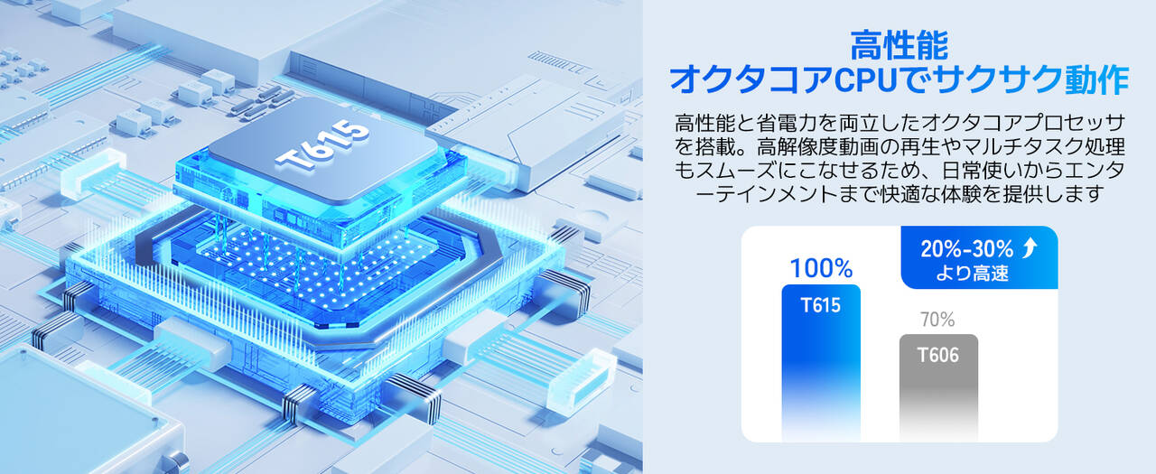 ▼SoCはUNISOC T615を搭載で、AnTuTu参考値は25万点。ローエンドとかエントリーとかそこいらの性能帯なので動作自体は最低限。価格なりといえば価格なり。ゲームではなく動画視聴とかメモ書きとかそういった用途向けです。↓