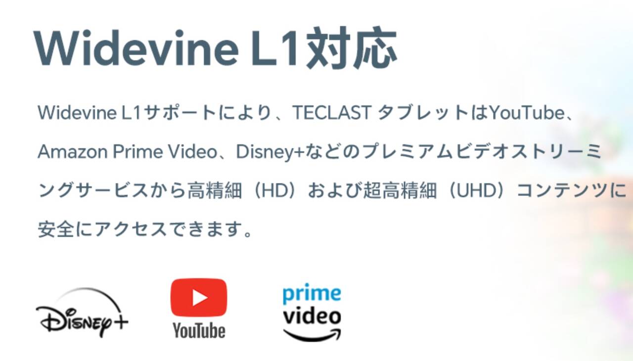 ▼WidevineはL1をサポート。Disney+やAmazonプライムビデオはHD画質で再生できる仕様です。但しNetflixはL1非対応らしくSD画質での再生となる点は注意。↓