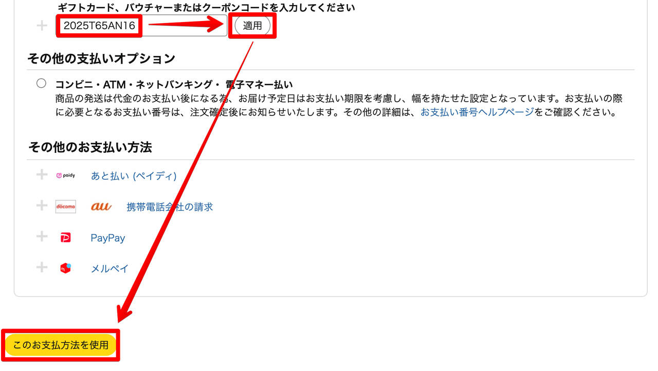 ▼カートに入れてレジへ進み、「ギフトカード、商品券、プロモーションコードを使用する」をクリック。以下の通りクーポンを適用しましょう!↓