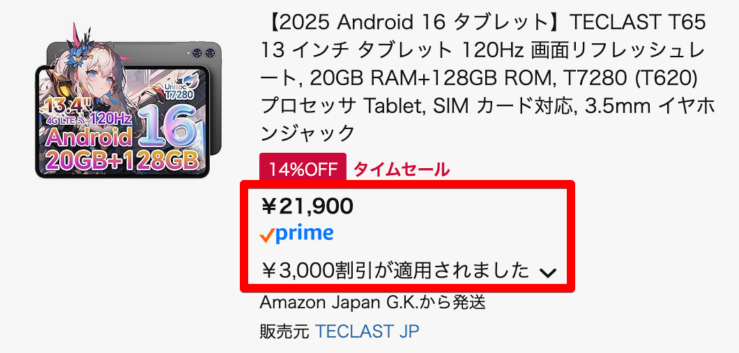 そんなこともあってか通常価格は28,900円と同性能帯のタブレットとして見ると少々値が張る印象を受けますが、クーポンコード「2025T65AN16」を入力すると21,900円まで値引きされちゃいます。