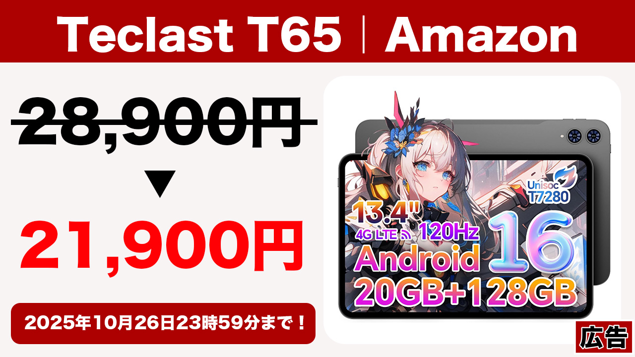 TeclastのUnisoc T7280を搭載した大型タブレット「T65」ですが、10月26日までの期間限定でガッツリお安くなるセールが開催されるとの情報をいただいたので本記事で紹介していきます!