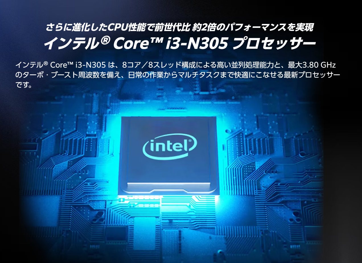 ▼TENKU Pocket8が搭載するCPUは第12世代のCore i3 N305を採用!この手のモデルってCeleronあたりが多かったんだけど、本機はそれより1コ背伸びしたグレードを積んでいるんですよね。↓