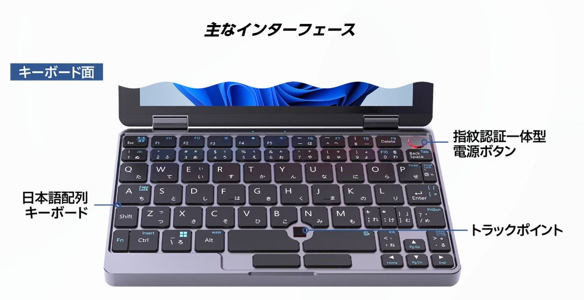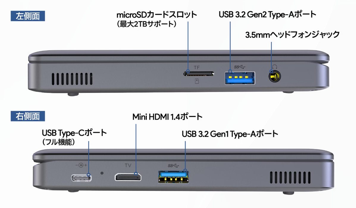 | インターフェース | USB Type-C×1 USB3.2 Gen2 Type-A×1 USB3.2 Gen1 Type-A×1 MicroSDスロット MiniHDMIポート×1 イヤホンジャック |
