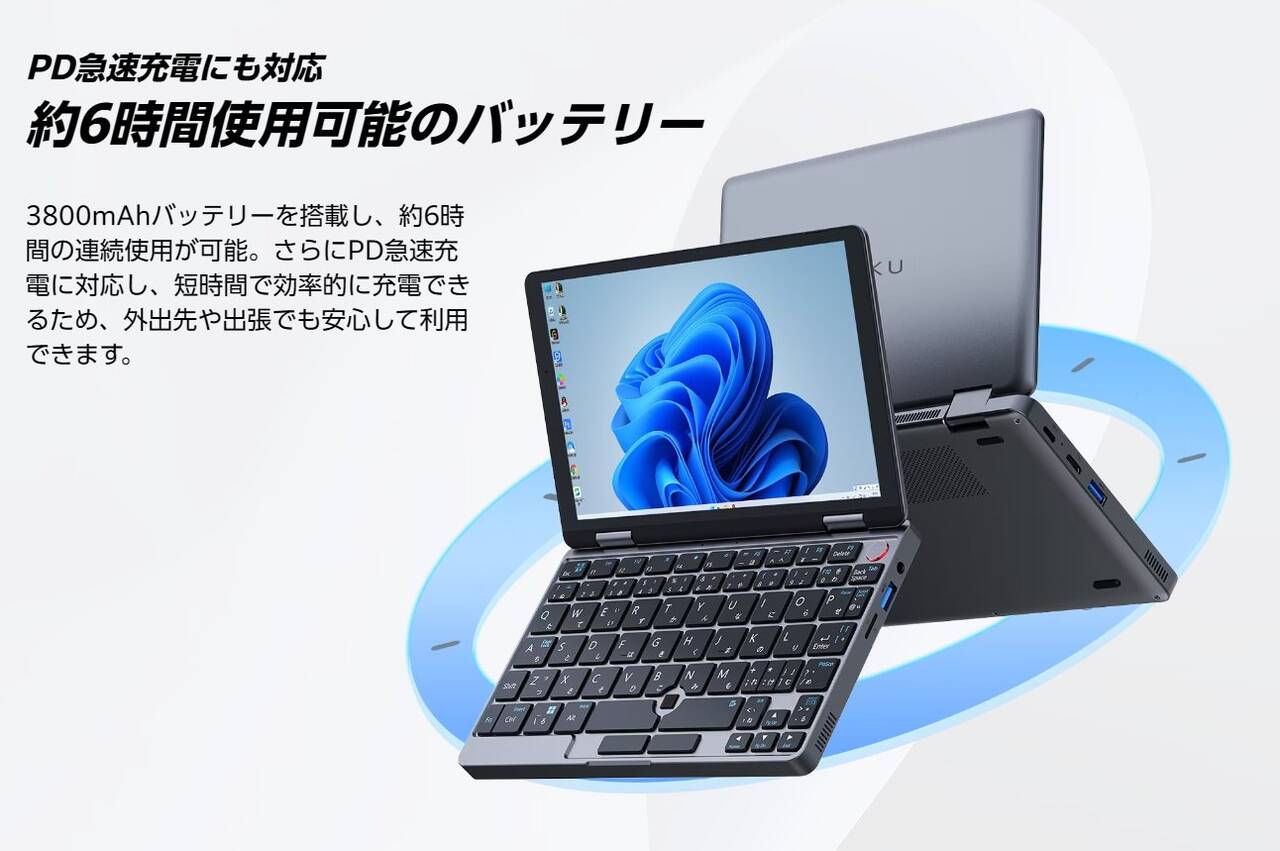 バッテリー容量は3,800mAh(28.88Wh)で、公称約6時間のスタミナを謳います。 PCとしてはかなり小容量な部類ですが、エネルギー密度自体はスマホよりも高め。