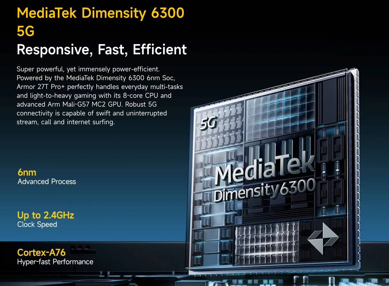 ▼Ulefone Armor 27T Pro+が搭載するSoCはMediaTek Dimensity 6300。メモリは12GBの大容量、ストレージは256GBでmicroSDは最大2TBに対応。↓