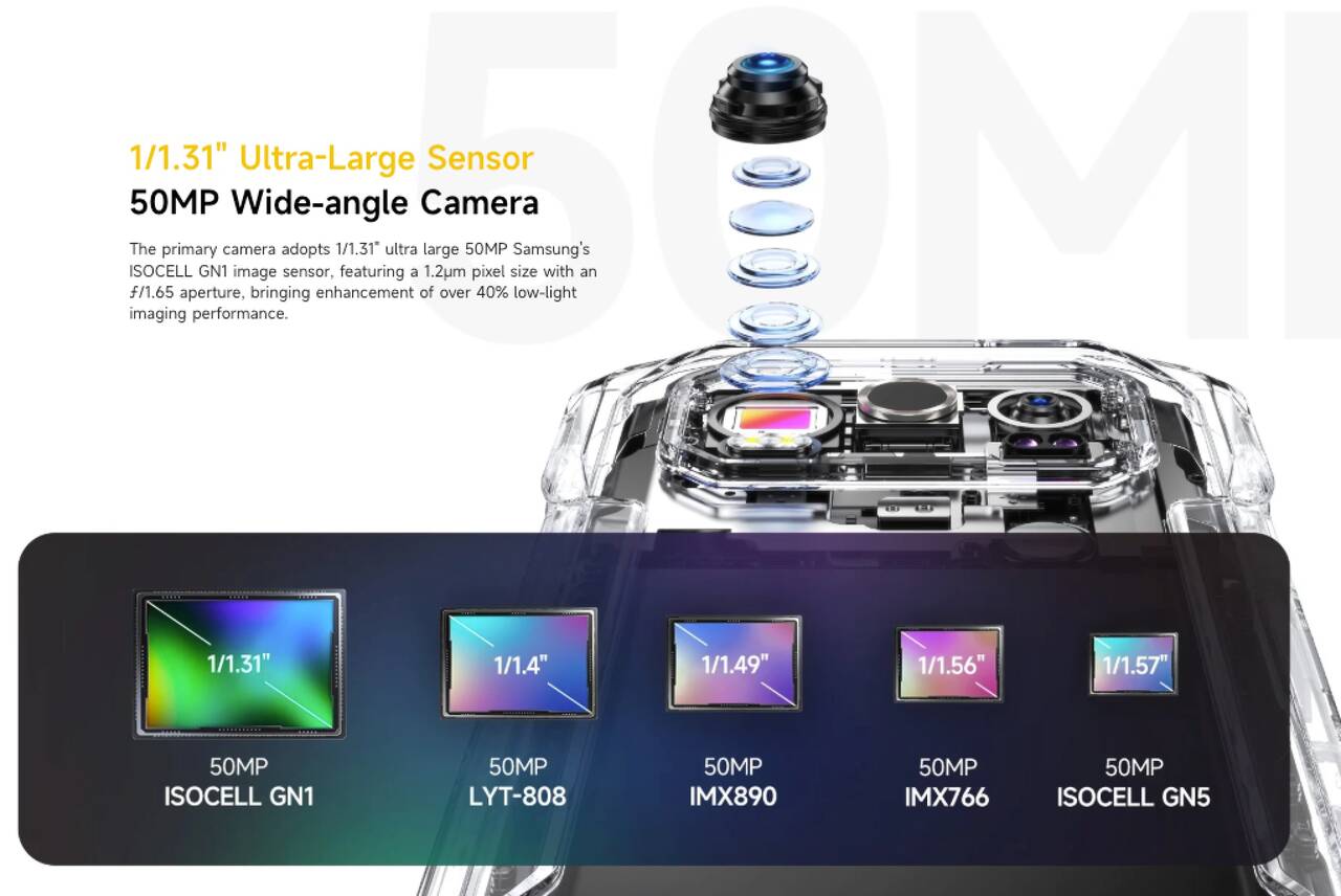 ▼メインカメラには、1/1.31インチの大型センサーであるSamsung ISOCELL GN1を採用。↓