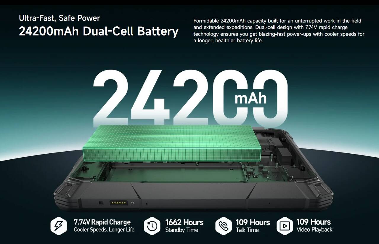 Ulefone Armor Pad 5 Ultraのバッテリーは24,200mAhというとてつもない大容量を搭載!今やたいていのスマホは4,000~5,000mAhが平均なのですが、本機はその4~5倍にもなるバッテリー、つまりスマホ4~5台分といえばわかりやすいでしょうか‥