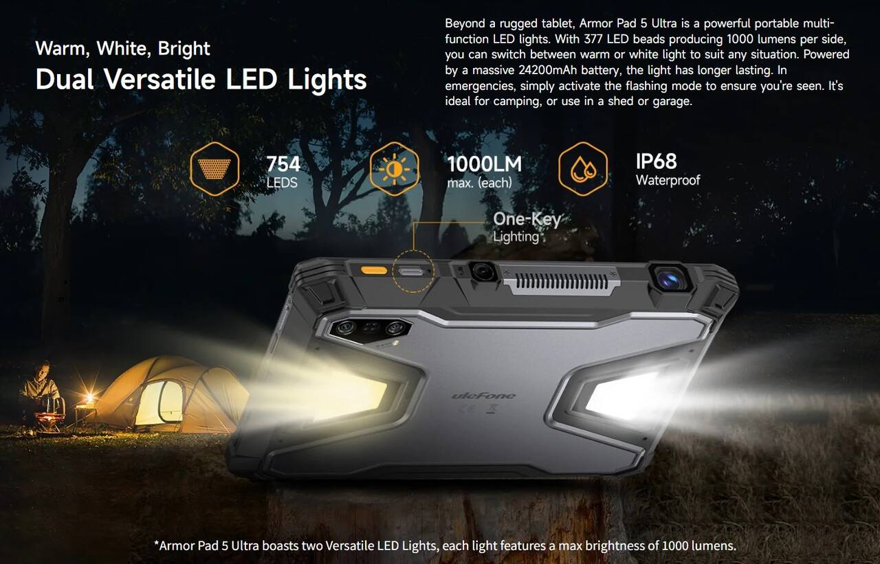 ▼Ulefone Armor Pad 5 Ultraは背面に巨大なLEDライトを2期搭載しているのが特徴!1つのライトにつき最大1,000ルーメンという明るさによりキャンプ用ライトと遜色ない明るさで周りを照らすことができます。↓