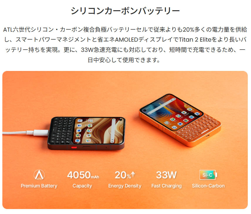 ▼バッテリー容量は4,050mAhです。Titan 2よりは容量が減っていますが、160g台のスマホとしては一般的な値です。33Wの有線充電に対応しています。↓